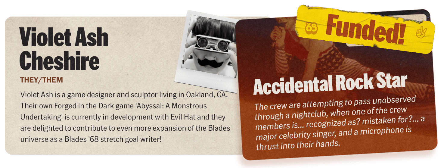 And remember: As soon as you back the project, you get immediate access to the full, text-only draft of the game along with the Blades '68 Roll20 Quickstart module.