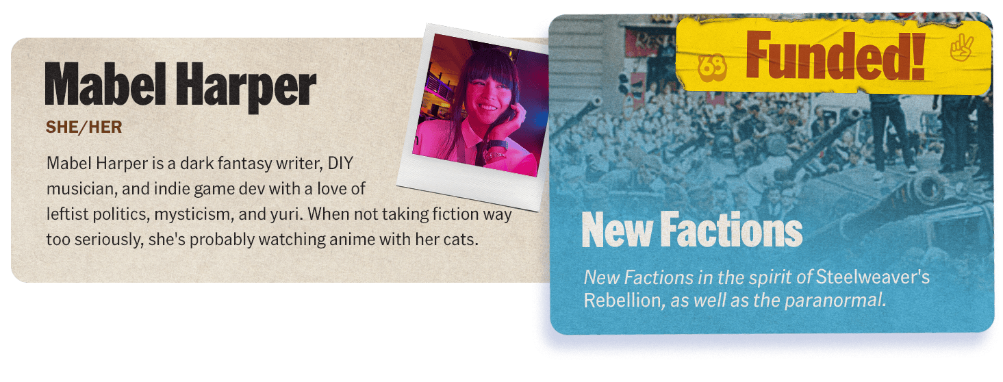 Put those PCs together into new Crews like the revolutionary Militants, thrill-seeking Racers, or the mysterious esoteric cult of the Utopians.