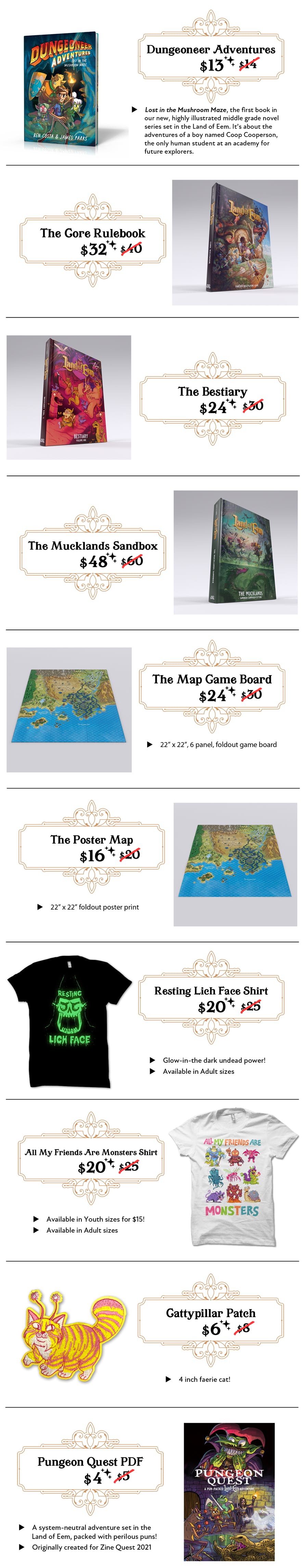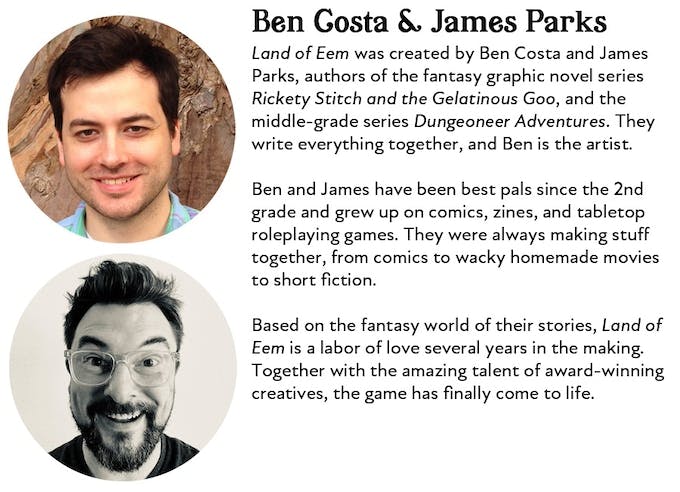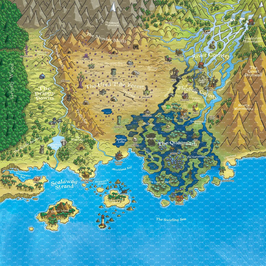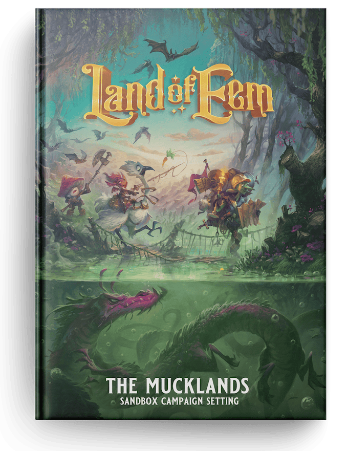 Land of Eem is set in the fantasy world of our book series Rickety Stitch and the Gelatinous Goo and Dungeoneer Adventures. But you don’t need to read the books to play! And the Mucklands Sandbox is almost entirely system-neutral, so GMs can use it with any RPG system or simply as inspiration for their own campaigns.