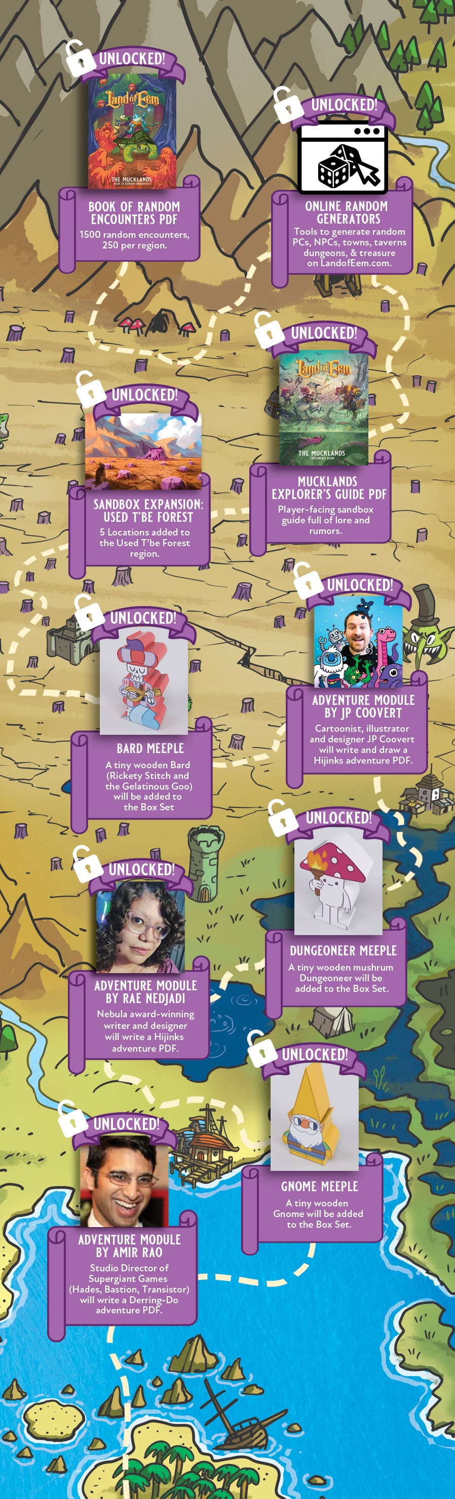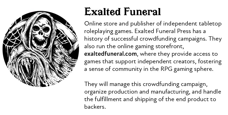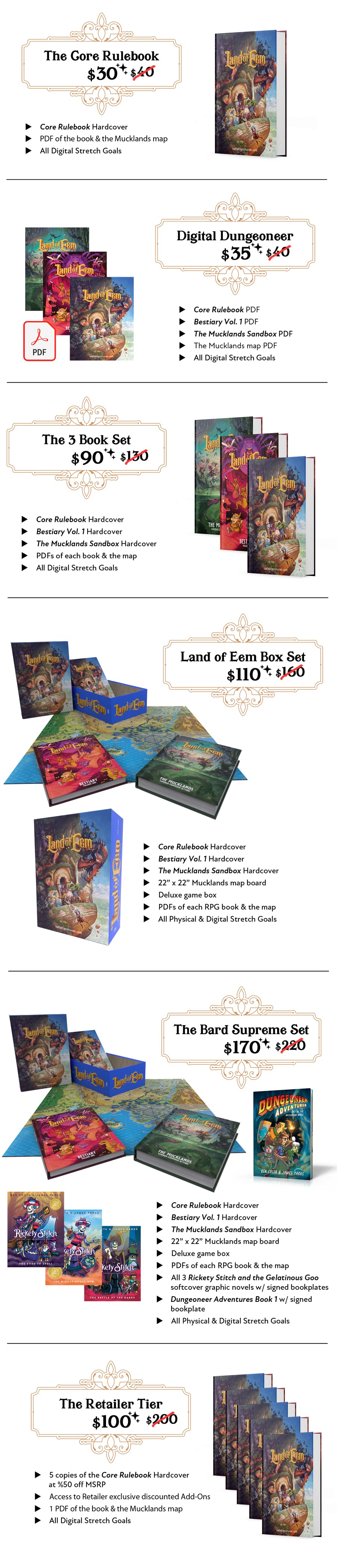 Together with Exalted Funeral, we're launching the Core Rulebook (approx. 200 pages), a Bestiary (approx. 180 pages), and the first Land of Eem Sandbox Campaign Setting: The Mucklands (approx. 400 pages), a realm of 6 unique regions filled to the brim with locations, NPCs, and quests. At the highest reward tiers, all three 8.5" x 11" hardcover books are packaged in a box set, complete with a 22" x 22" foldout Mucklands map gameboard.
