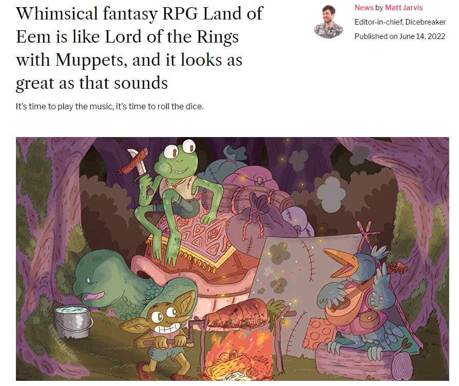 The Lord of the Rings meets The Muppets in this lighthearted fantasy tabletop roleplaying game! Land of Eem is packed with simple rules and resources that encourage players to be creative and make GMing easy.