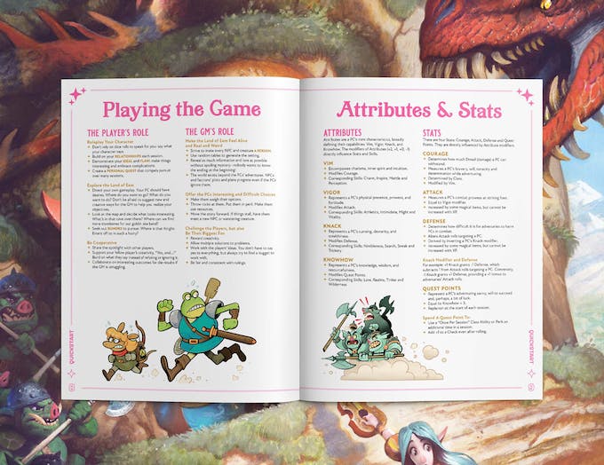 Land of Eem is a lighthearted fantasy RPG presented in an easy to use, easy to learn Core Rulebook (approx. 200 pages) that contains everything you need to begin play. It's packed with rules and resources that encourage players to be creative and ease the burden on GMs. Download the Quickstart Guide to get started!