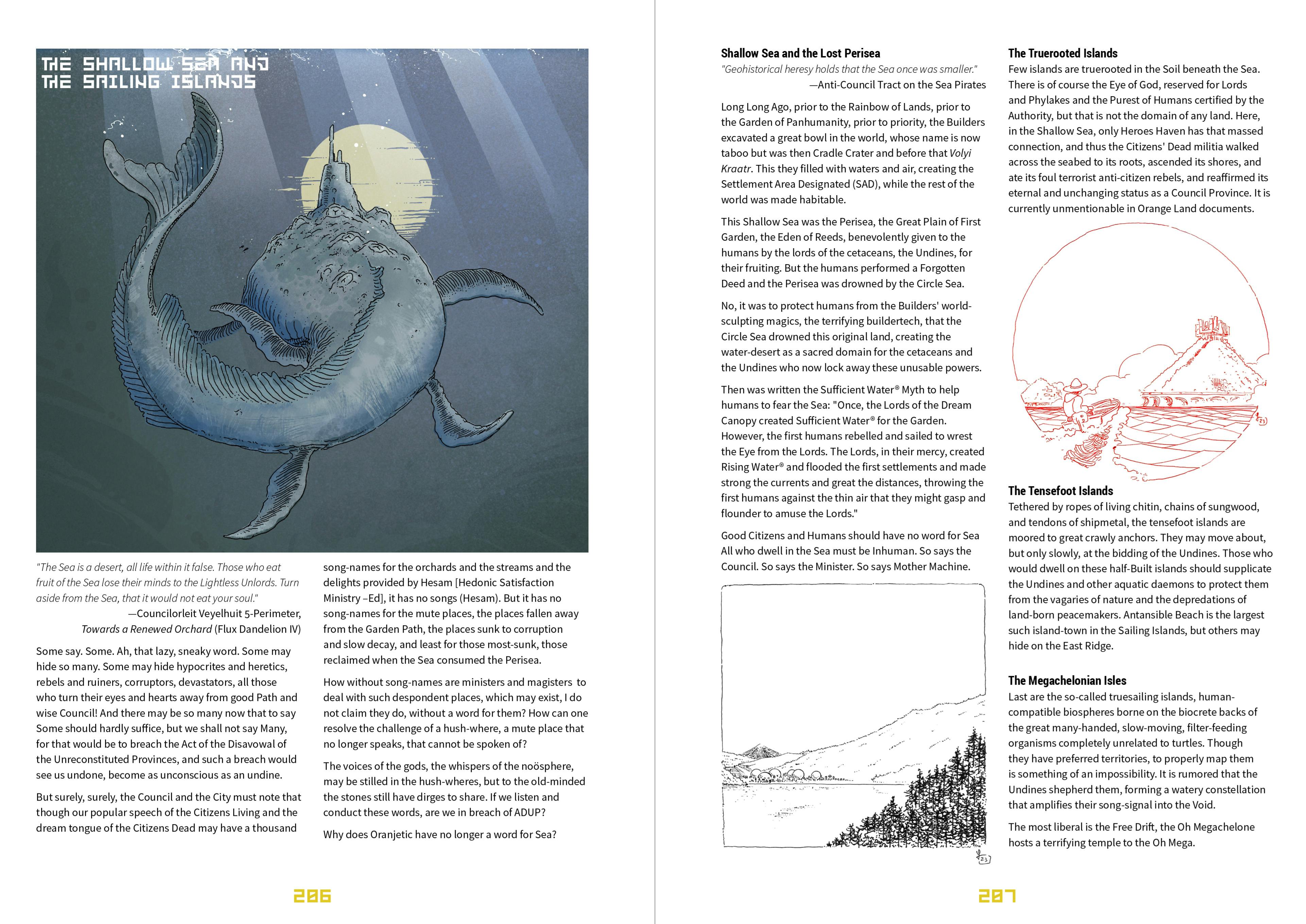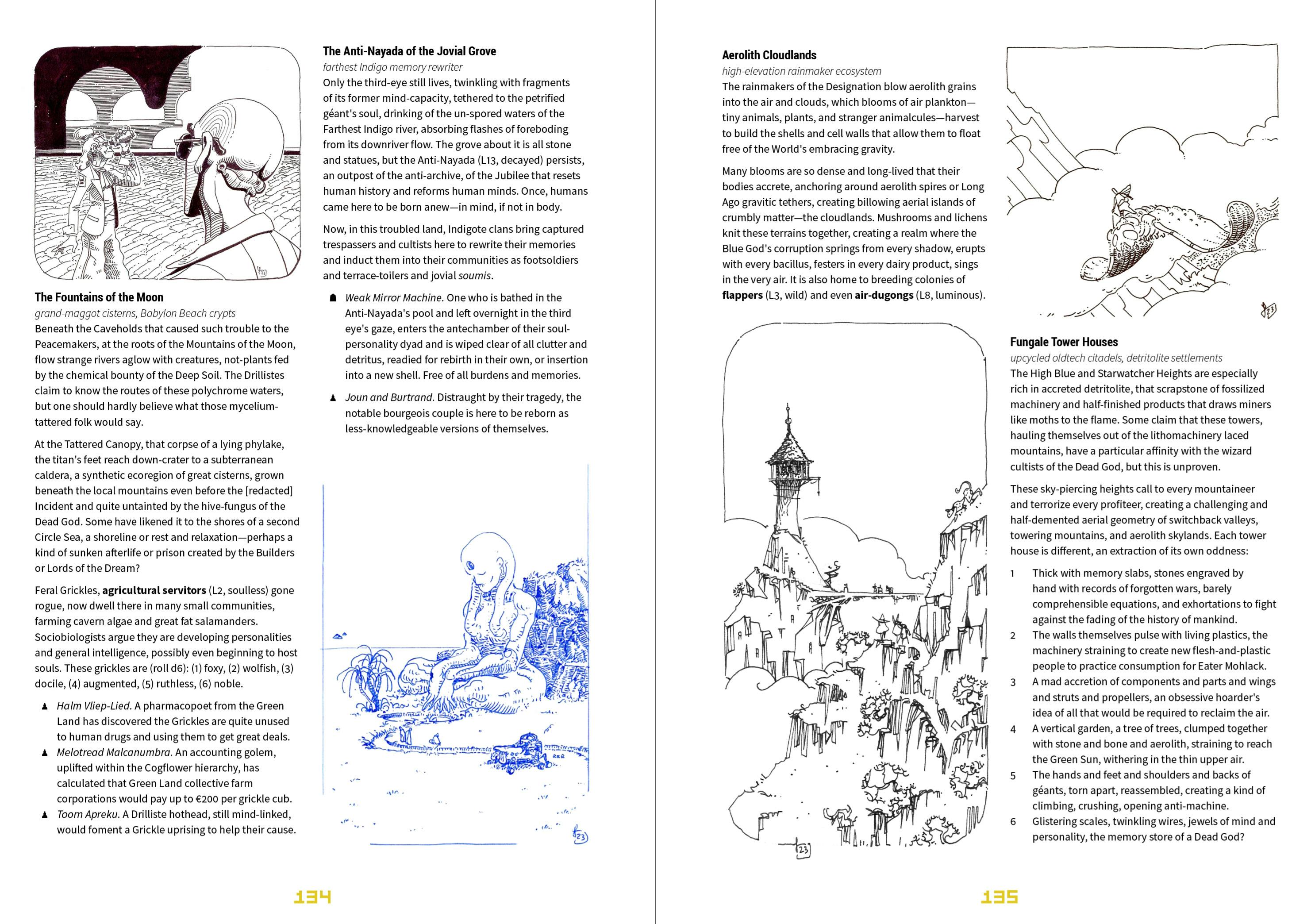 The OGA book is very close to done now. I've got a couple of spreads still to wrap up for the Purple Land and a quarter page to art-up for the Green Land, but aside from that all the lands are ready for the editor. I've slotted the Omega Jubilee section back in ... and that leaves about 20–26 pages to brush into shape. The manuscript is still at 288 pages, so that means squeezing about ~40ish pages together into ~20. I'm pretty sure I know what's going to get left out at this point: I've already left out the Noösphere chapter, and the Near Void is probably also going to be its own thing. I want to add about 12 pages summarizing additional sublocations in each Land, but that might not make it, or become an appendix all its own if I have the space left. We shall see.