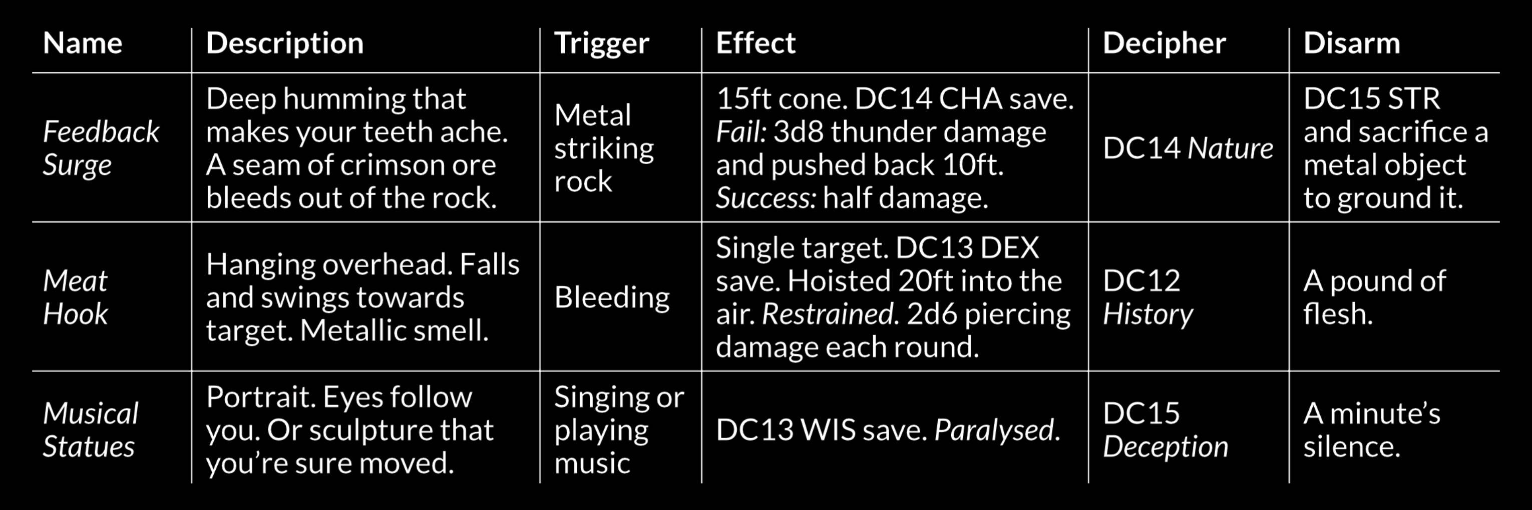 7 fiendish traps, from Pyrotechnics to the Cat Burglar, each with triggers, effects, and ways to disarm them