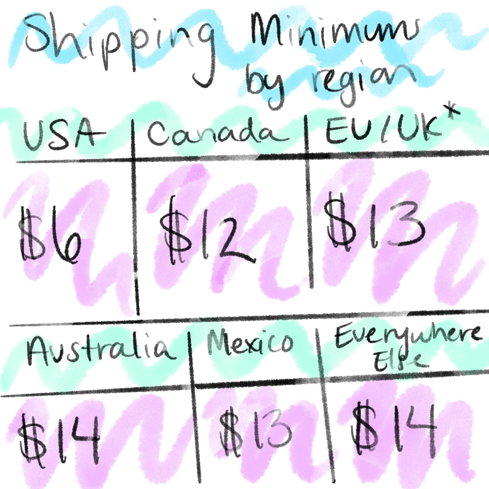 See the chart below for estimated shipping costs - keep in mind that these are only potential estimates, and not a guarantee, and are likely to increase rather than decrease. Shipping costs are charged after surveys are sent out and I have gathered your address, so keep in mind that shipping is an additional charge on top of your pledge. This allows for a much more accurate shipping price and eliminates guesswork (that often ends in a deficit in funds on my part!).