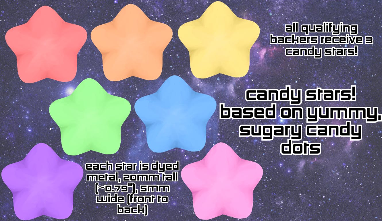 My freebie pins (yes, pinS! Each qualifying backer receives THREE mini stars!) are designed after those yummy, sweet candy dots you eat off of paper backing - but in the shape of cute puffy stars in a variety of pastel colors! Each pin measures 20mm (roughly 0.79") in size and will be dyed metal - additionally, they will be three dimensional with a depth of 5mm (roughly 0.2").