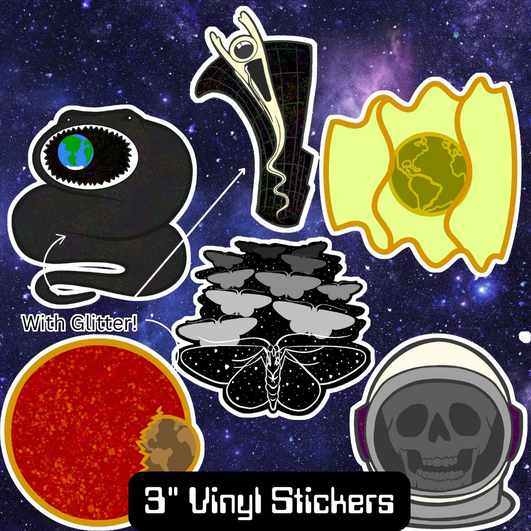 These 3" (4" for spaghettification) vinyl stickers will mirror their pin counterparts; Spaghettification, Devourer and Red Giant will be glittery, while Gamma Ray will be transparent!