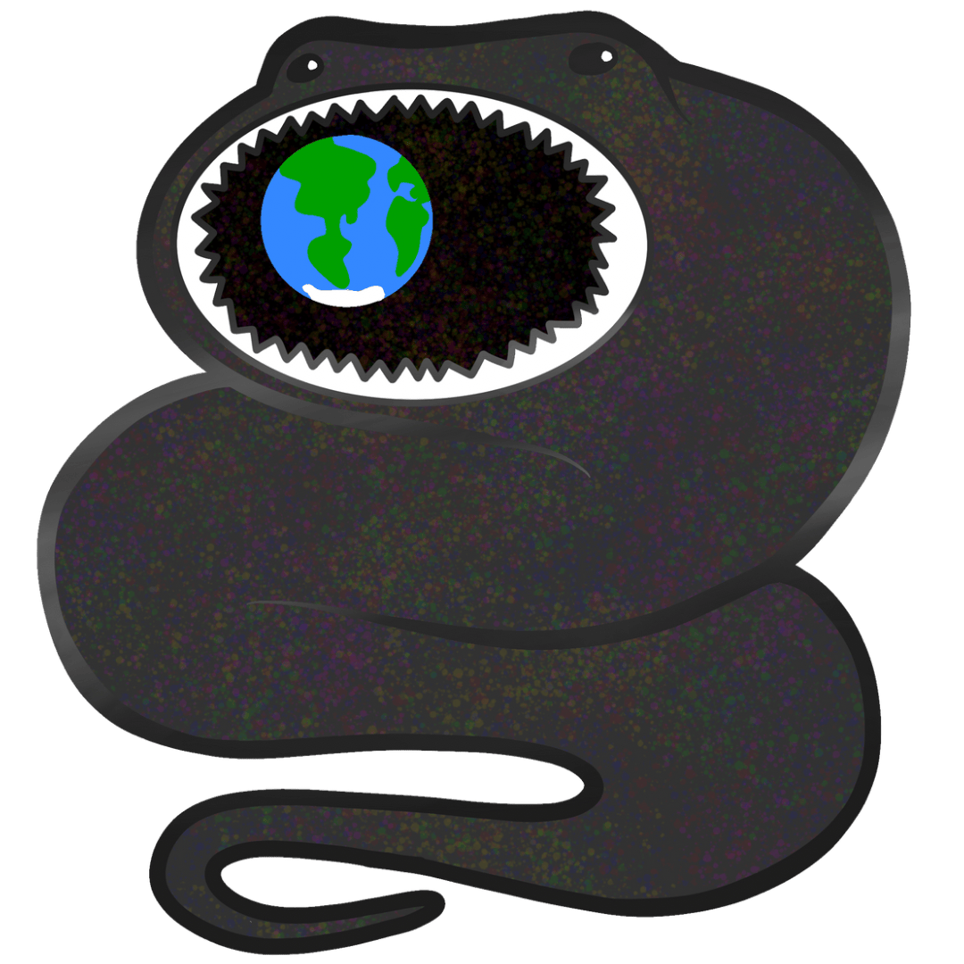 This 1.5" enamel pin will feature a fictional, made-of-dark-matter, serpent-like, planet-devouring monster - this pin will be made with glittery dark gray soft enamel, white enamel for the teeth, black glittery soft enamel inside the mouth, and a planet with screen printed details moments from being devoured! As with the other 2 pins, this one will have a glossy clear epoxy finish and dark nickel plating.