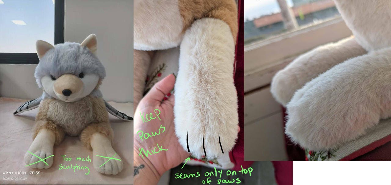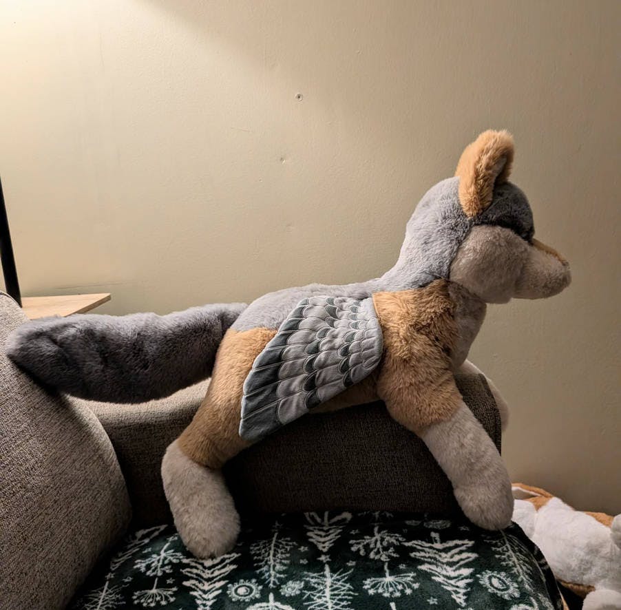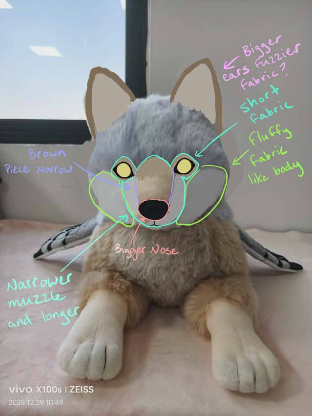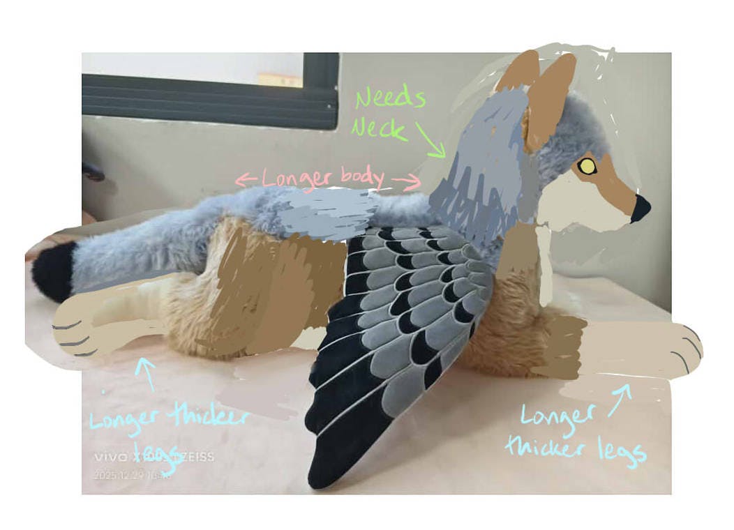 Hey everyone! I finally received pics of Coyote pigeon last night! To say I'm bummed is an understatement. For some reason Tina's company just made their fox pattern bigger for Coyote Pigeon. This is NOT what I wanted at all. I had sent them a Magpie Wolf to draft a pattern from. I'm not sure where the confusion came from unless they thought I just wanted Magpie Wolf to follow that pattern. I am clearing things up with them now to have a better sample made.
