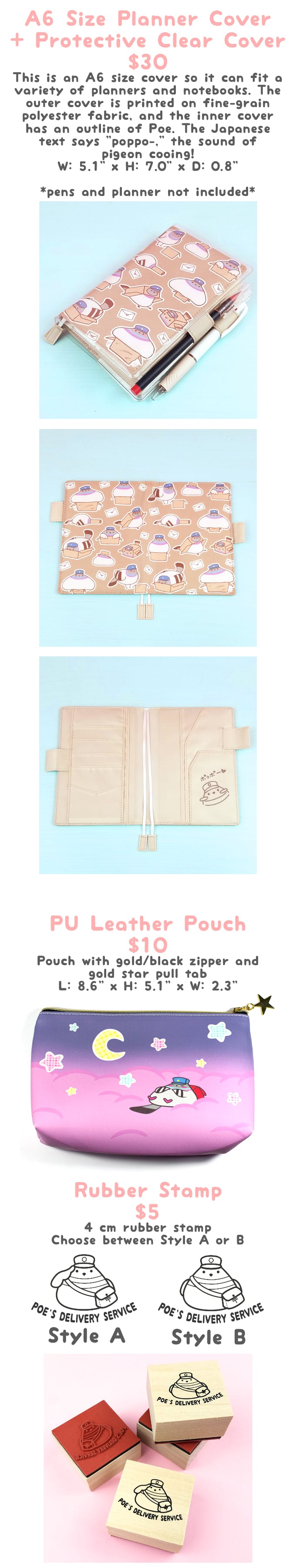 20mm wide by 10m long washi with Poe design Folding note pad book with 5 types of page flags, 3 big note pads, 2 small note pads, and 2 shaped note pads. The cover will be holographic! Poe design A little bag to contain all of the goodies <3 Little jute bag with Poe screenprint