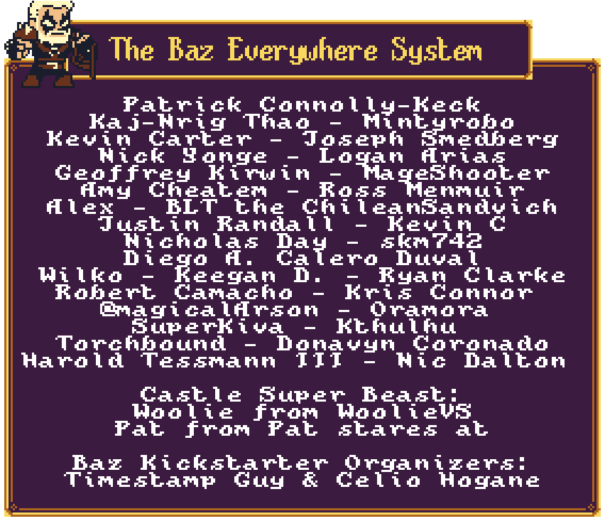 By this point, both of the hidden character slots in the crowdfund were taken, but I agreed to make an exception and add a third for Baz. Just like with Libbie, Baz was added to the game via another community fund, this time organized by Timestamp Guy & Celio Hogane under the name "The Baz Everywhere System".