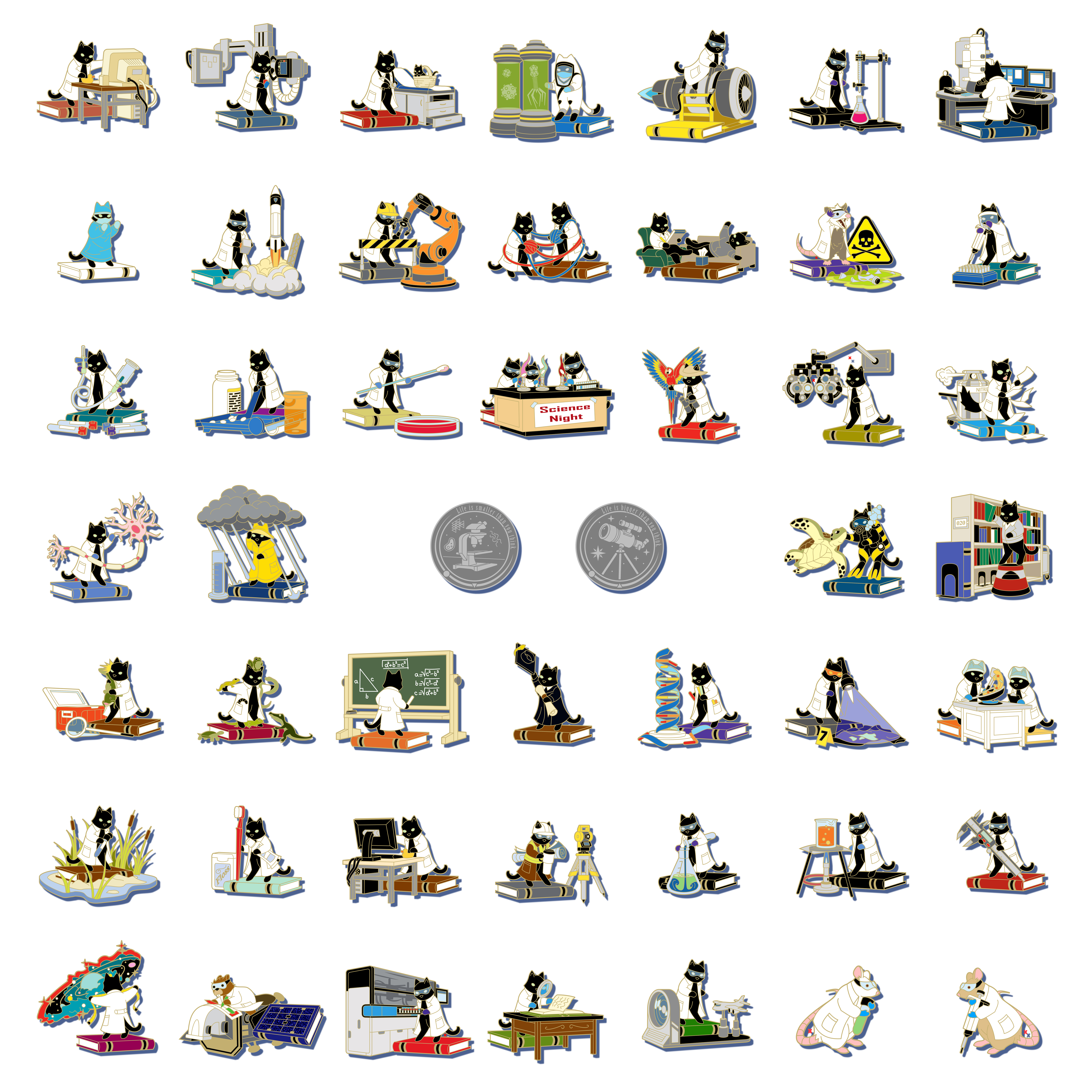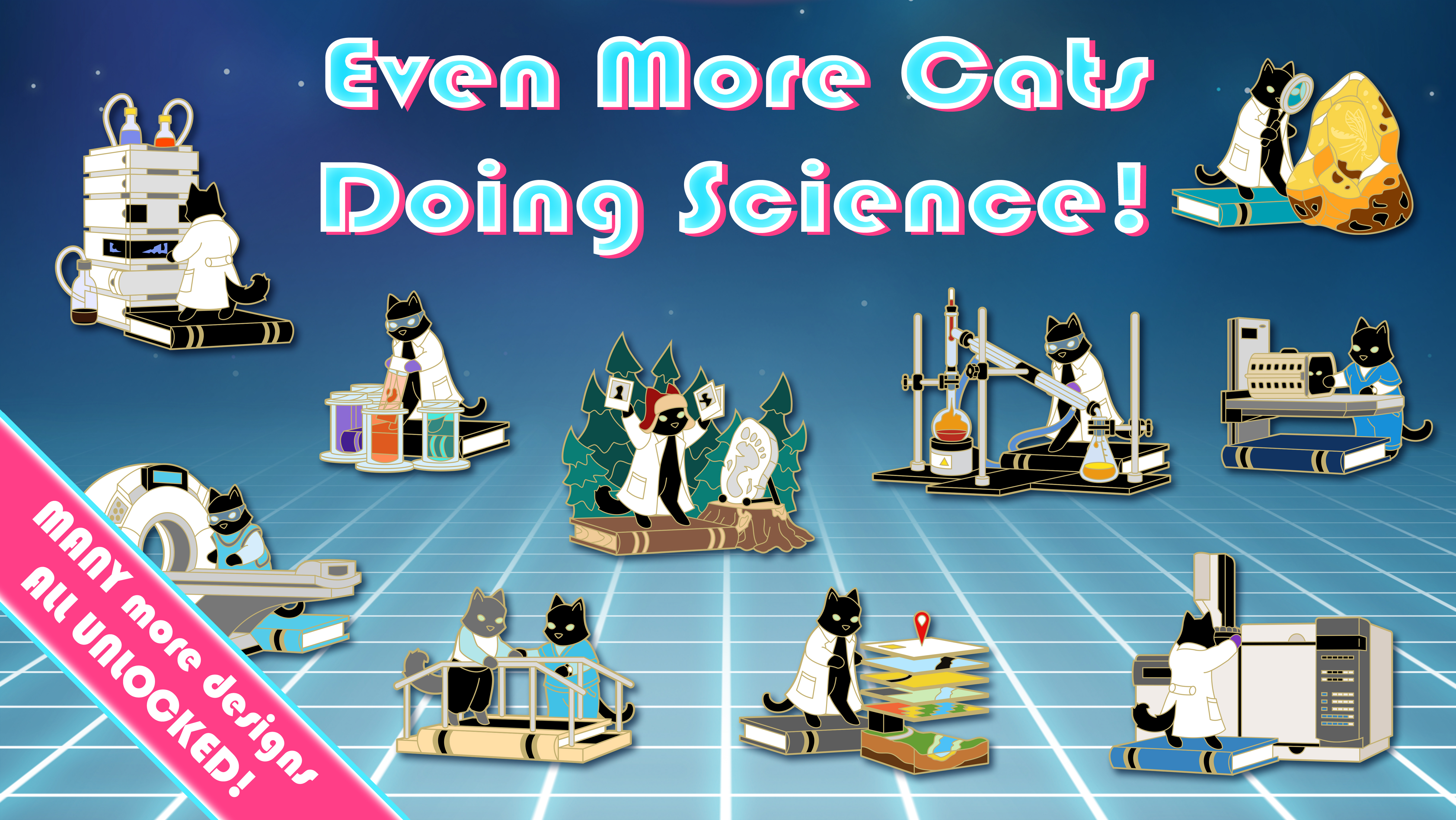 I have designed and released over 40 Cats Doing Science pin designs. Help me bring EVEN MORE Science Cats into the world!