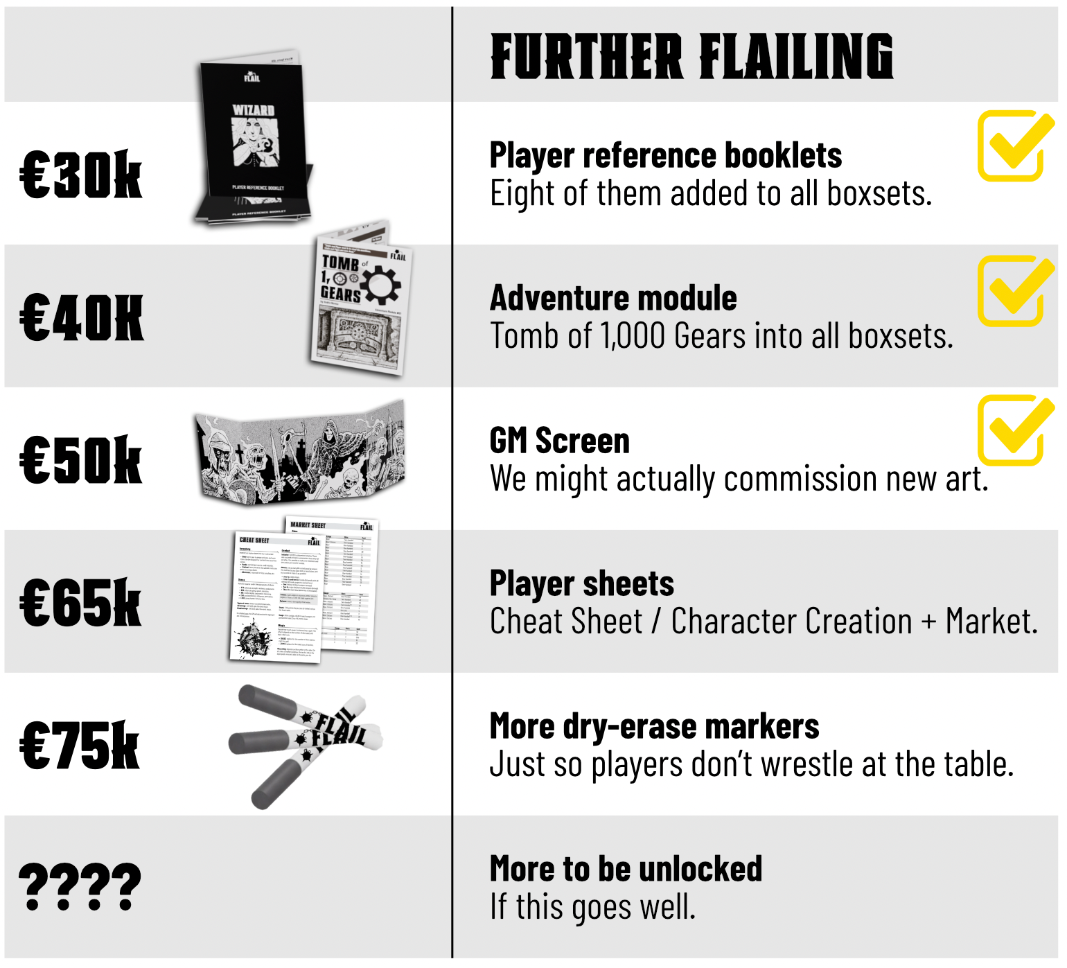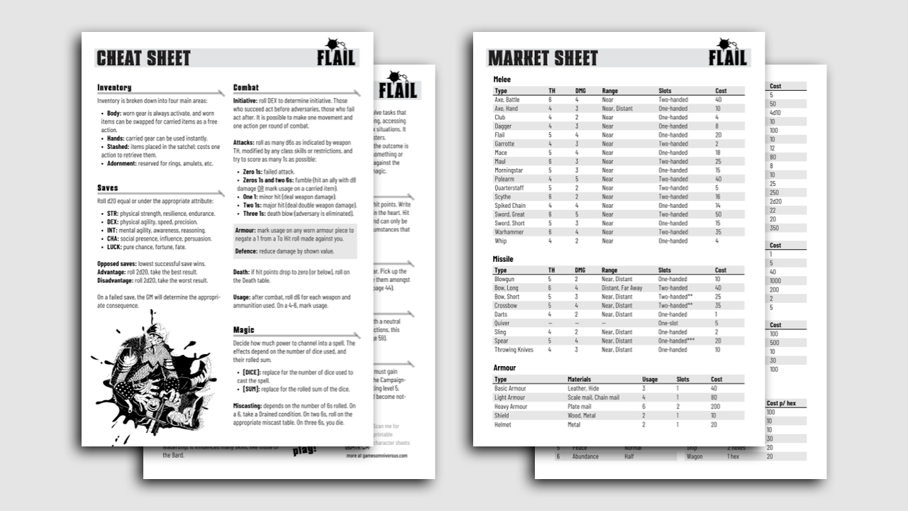 The Player Sheets are officially in! Every boxset will now come with two double-sided player-facing sheets. The first contains all basic FLAIL rules and a character creation summary on the other side. The second sheet contains tables with prices for everything. Easy access at the gaming table. THANK THANKKKKKKKKK YOU YOU YOU