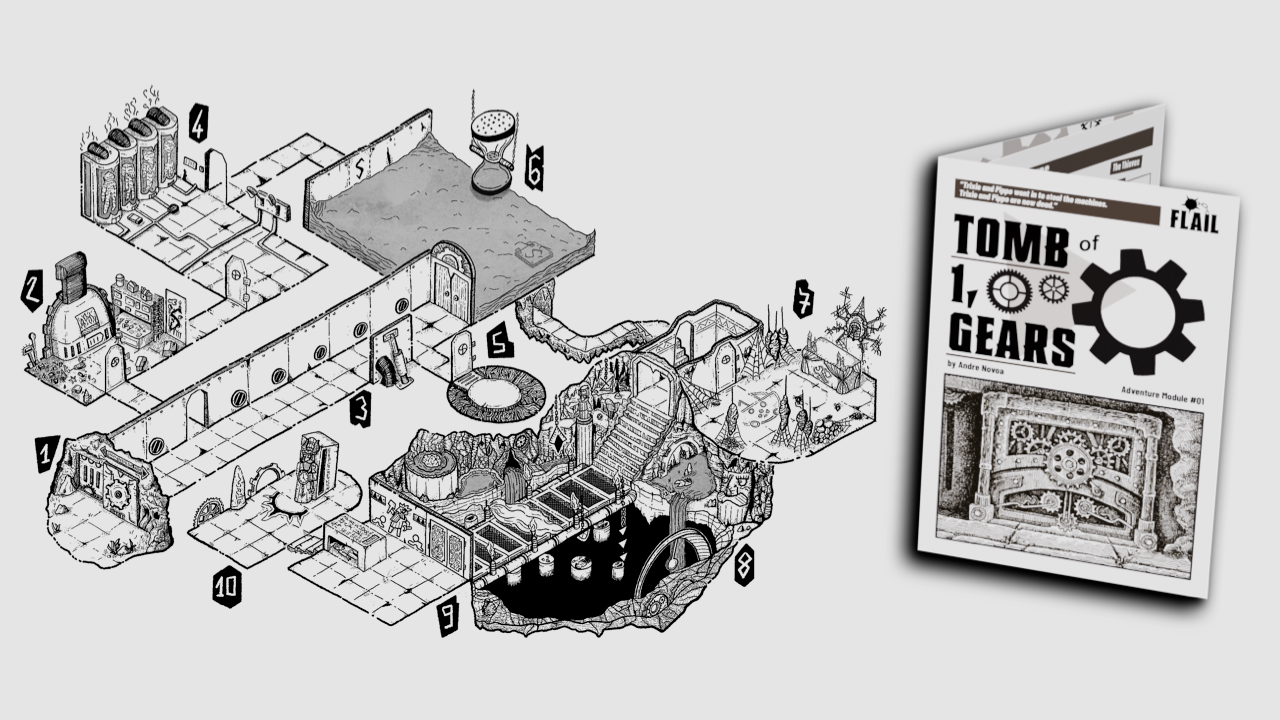 Now, we move on to the second STRETCH GOAL: the first FLAIL official module TOMB OF 1,000 GEARS. It leans into the "puzzle-trap dungeon" trope. A paranoid gnome inventor, Master Gnorbitt, designed his own tomb so that only someone worthy could break it and claim his ultimate prize. Minimal design, very low-prep, a "grab-and-go" sort of experience. I end up always taking about 2-3 hours to play these things anyway, so this is all i need for a good session of play.