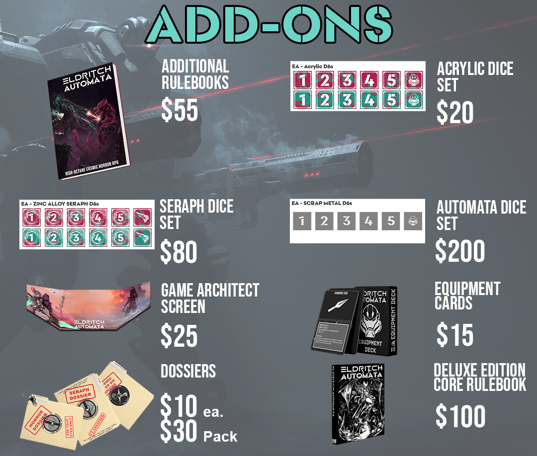 While the manuscript for the core rulebook for Eldritch Automata is nearly complete, there’s still a lot of work to be done. Following this campaign, our focus is to finalize the manuscript and move to art direction and editing. That will take the bulk of time between now and release, followed by layout, final approvals, and printing and shipping. While we hope to see a release by December 2024, we want to be clear upfront that this roadmap may go into 2025.