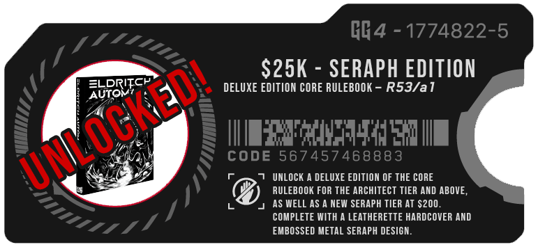 Help us unlock the Deluxe edition of the core rulebook, complete with a leatherette hardcover and embossed metal Seraph design. As a thank you for getting us to $25k, all reward tiers above Horror will be upgraded to a deluxe edition book, and we'll add a unique "SERAPH" tier for $200!
