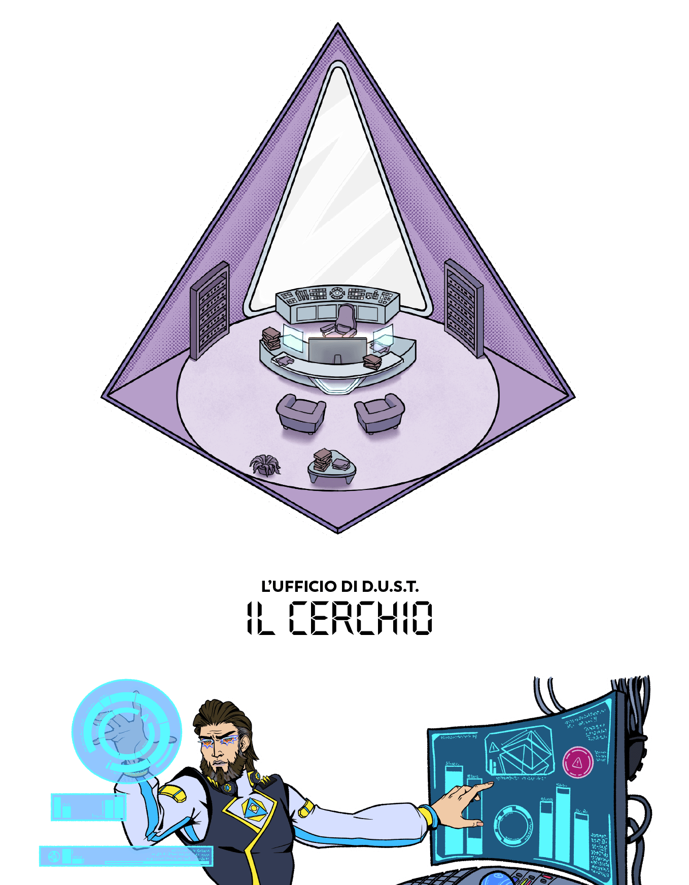 Abbiamo poi mostrato un luogo centrale dell’universo di Fulcrum: Il Cerchio, l’ufficio del Direttore di D.U.S.T., illustrato da Yona. Qui il focus si sposta su un punto nevralgico dell’universo narrativo di Dice First, il luogo da cui le missioni degli agenti prendono forma.