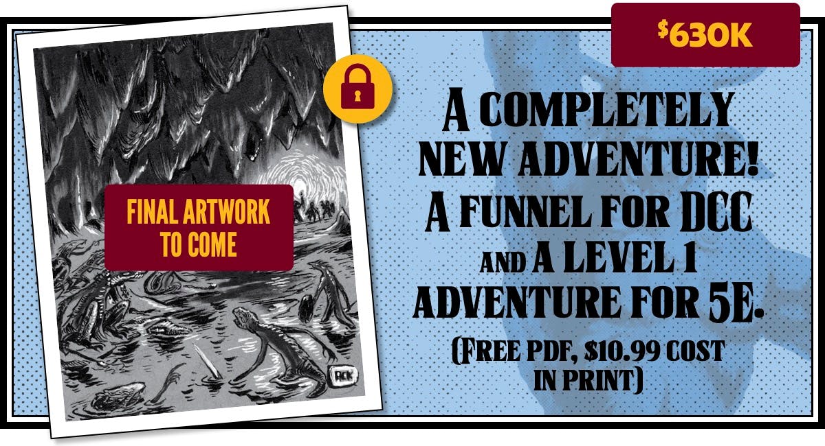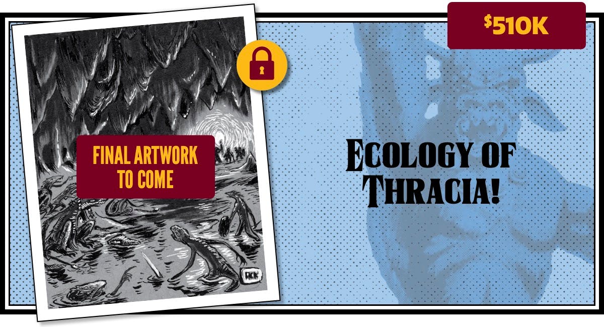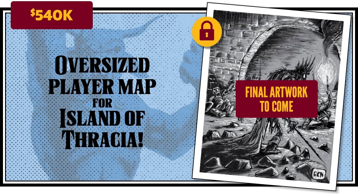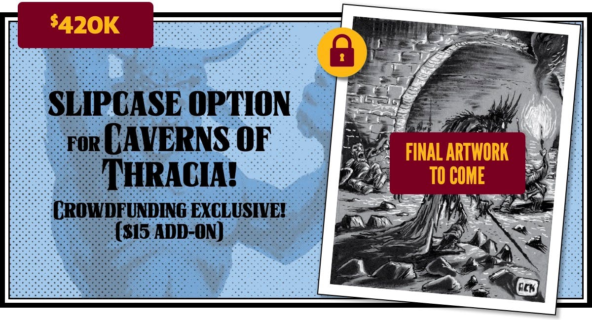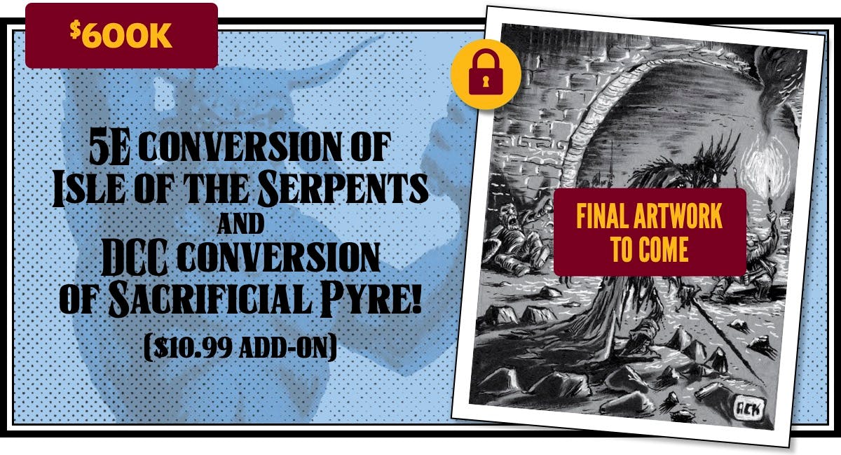 We just added even more stretch goals, including several that fulfill multiple backer requests: a new Thracia funnel, DCC conversion of "Sacrificial Pyre of Thracia" and 5E conversion of "Beneath the Isle of Serpents," a slipcase add-on, and many more. Here they are!