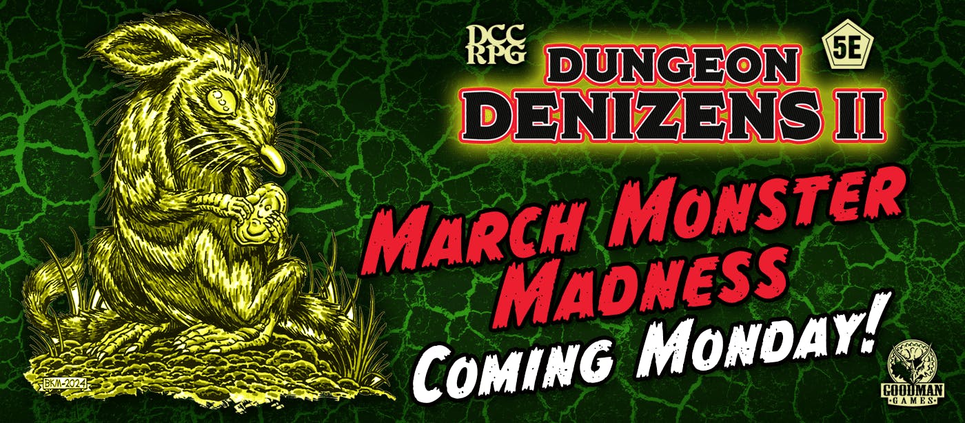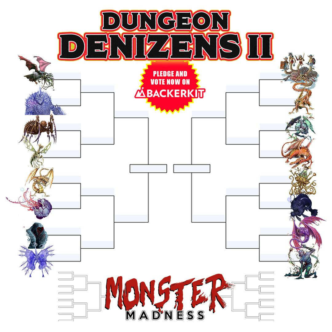 We'll be doing March Monster Madness here on Dungeon Denizens 2. Yes you read that right! The first round is next Monday March 24. There's a bracket for the bouts (shown below). Each day, backers will vote on "who would win in a fight - this monster or that monster?"