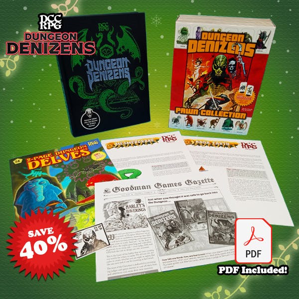 Save 40% from MSRP plus get a free PDF! This monumental DCC pledge level includes all the Dungeon Denizens goodness and stretch goals. You'll receive the two-tone foil reptile-hide special edition of the book, which has the extra 16 bonus pages in the back which aren't included in the regular edition, for a total of more than 550 fully-statted, full color monsters! Plus you'll get the cardstock pawn collection, 2-Page Dungeon Delves, and the Mesmerdrake and Spirit Naga stretch goals, plus Goodman Games Gazette, sticker, and PDF editions!