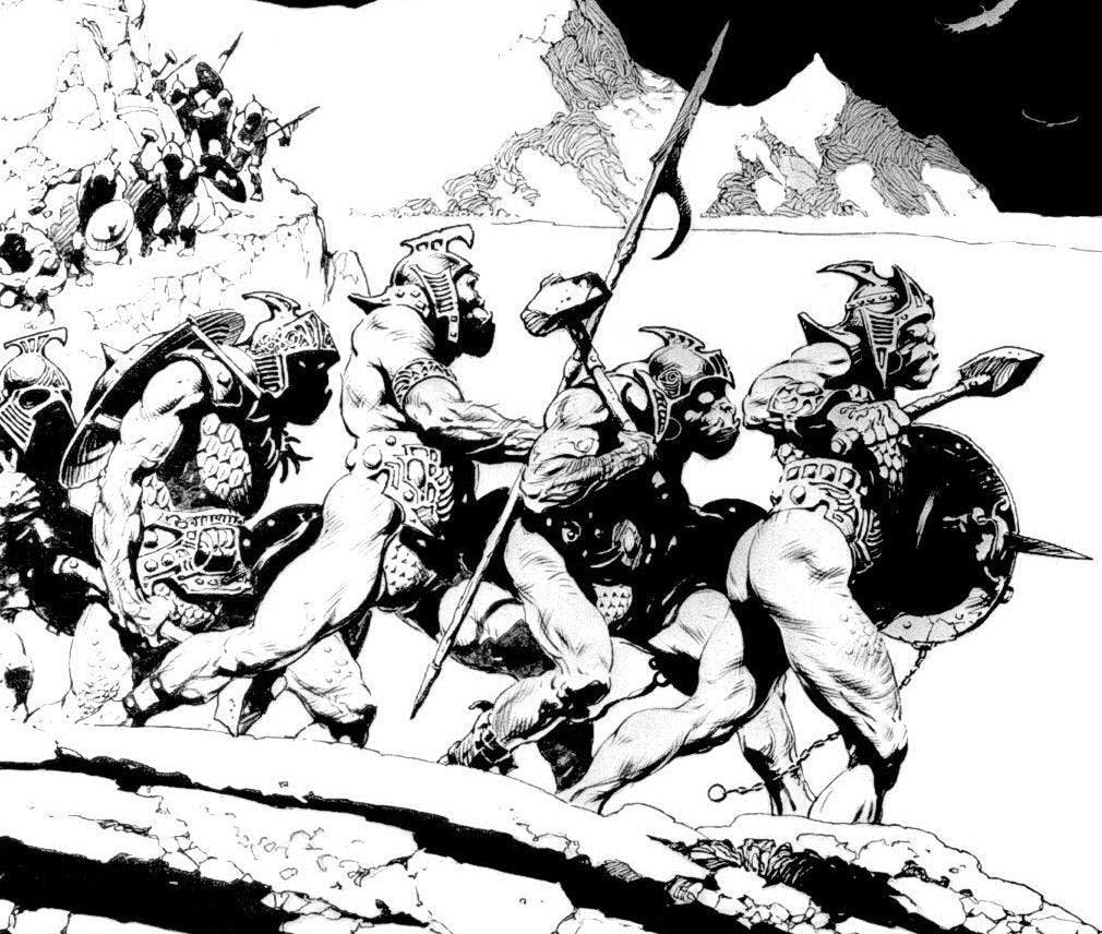But even here, you can detect Frazetta’s enduring influence. For Grell’s Warlord certainly draws its own inspiration from Frazetta’s Carter.
