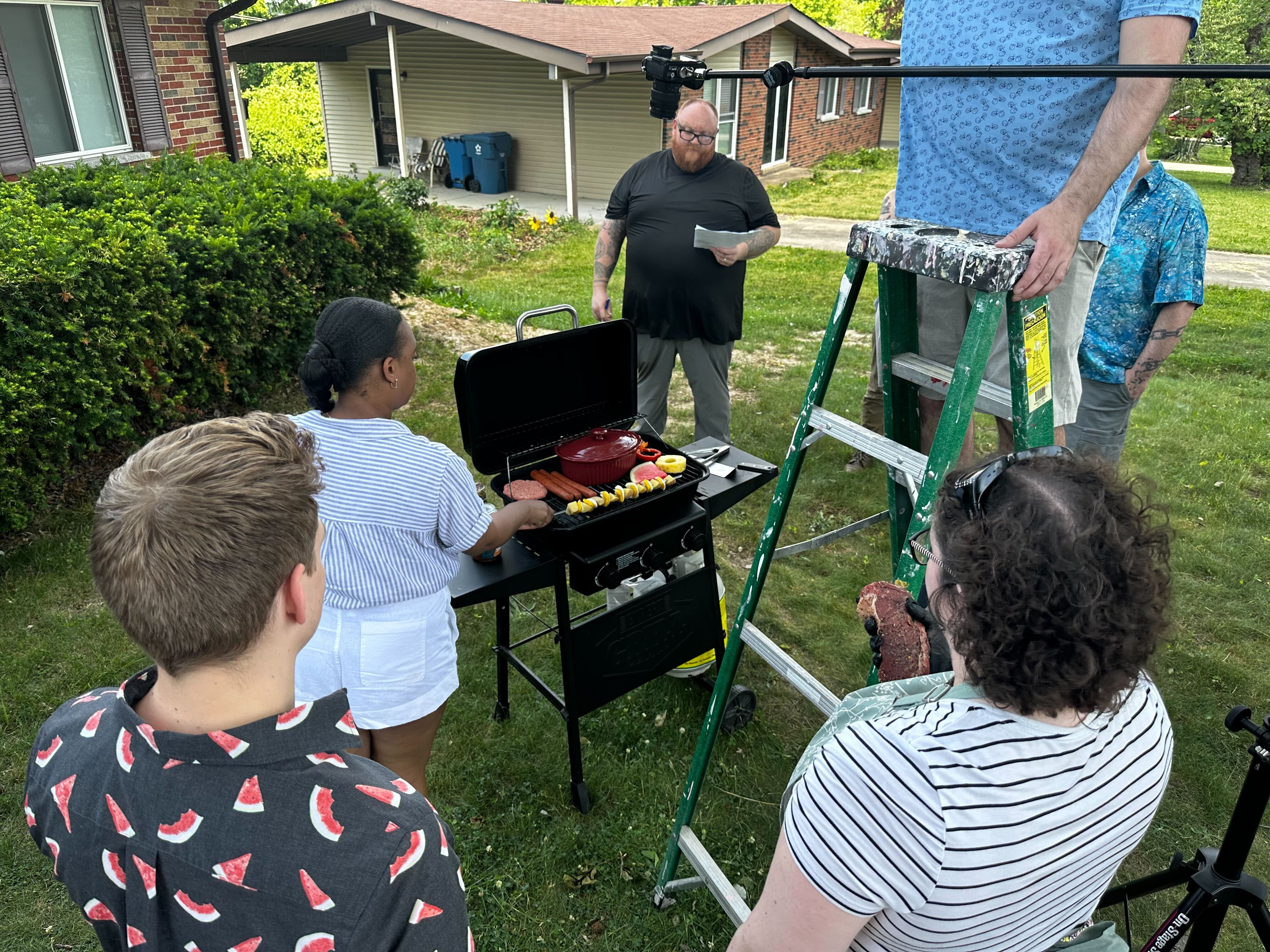Yes, an actual cul-de-sac to use as our backdrop! Here you can see yours truly being the Grill Dad! Grill Dad, despite the name, was going to be anyone on the day of the shoot. I happened to have the best apron. Obviously. I mean look at that thing. You can also see our cameraman and editor Trevor Casterline as well as GTG Brand Manager Geddy Cary-Avery getting some behind-the-scenes shots. Who took the behind-the-scenes of the behind-the-scenes? Who could say. (Genuinely. I’m pretty sure it was GTG Art Director Darrell Louder, but maybe not?)