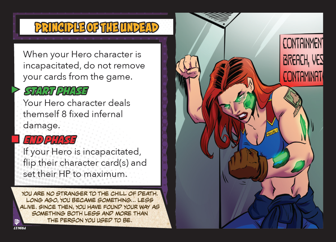 - Principle of the Undead: When you die, no you don't. You always come back during your END PHASE. However, you're fading fast during your START PHASE, so you're gonna have at least a turn or two of using your Incapacitated abilities over the course of the game. But, not to worry! You'll be back!
