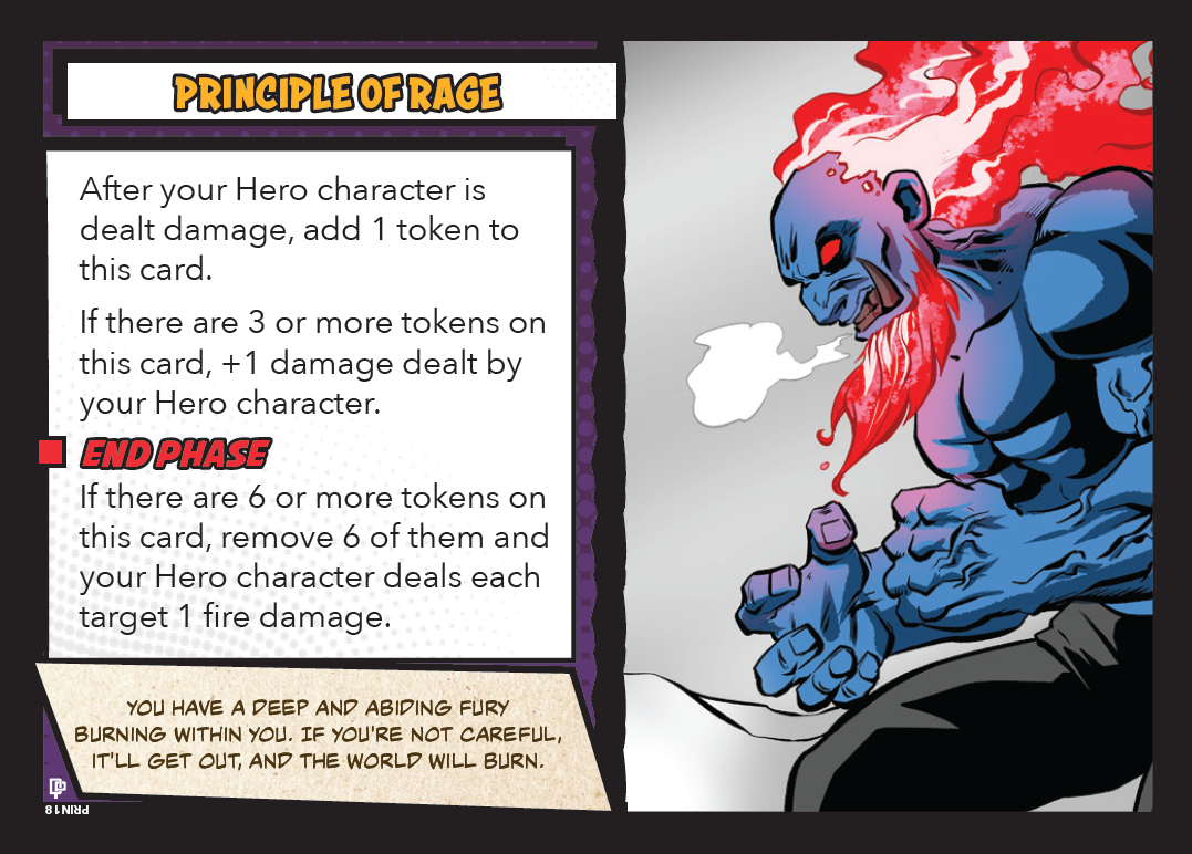 - Principle of Rage: When you take damage, you get tokens on this Principle. As long as you have at least 3 tokens, you get +1 to all the damage you deal. But! Once you get 6 or more tokens, your rage explodes! You remove 6 tokens and deal everything 1 fire damage. Note that if you happen to have 9 tokens (or more) at your END PHASE, when you remove 6 of them, the 1 fire damage you'll deal everyone is actually 2 fire damage, as its bolstered by your own rage! Could be good... could be bad... can you manage your rage? I hope so!