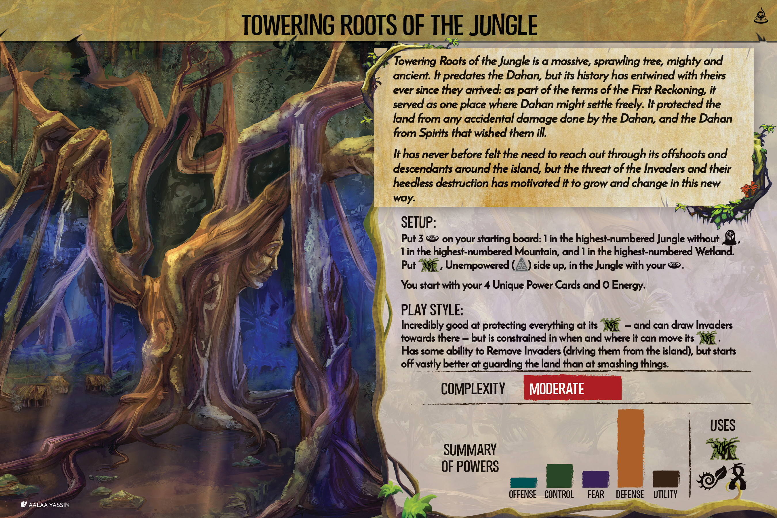 With that simplification understood - the Spirits had a variety of desires: to keep track of the Dahan and what they were doing, to understand them better, to support them living on the island, to enforce the terms of the First Reckoning, and more. A number of Spirits got involved in this, and one of the more obvious and prominent ones was Towering Roots of the Jungle.