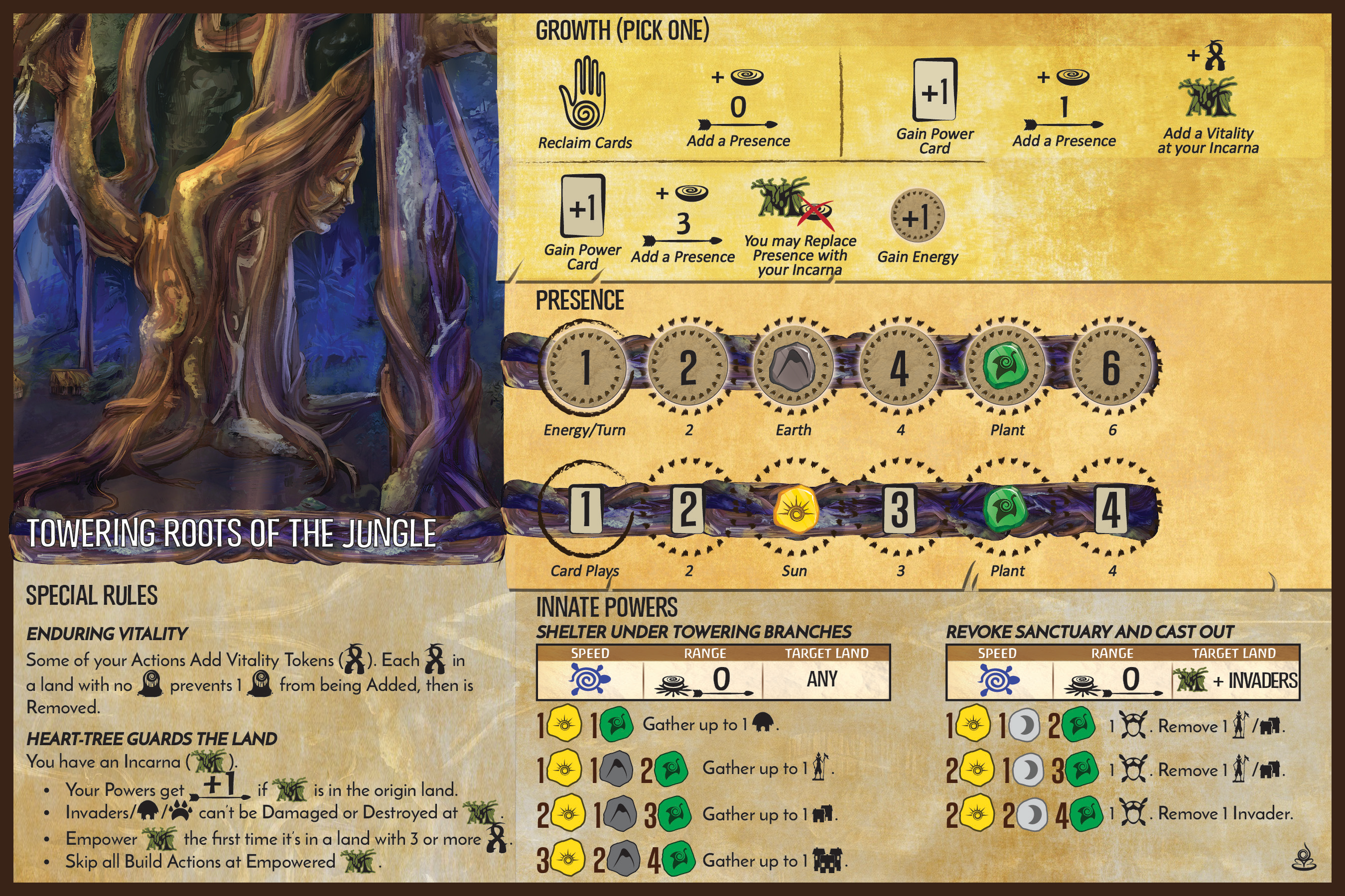 Towering Roots started out as one of the potential spirits for Horizons of Spirit Island, with a Gathering innate power, and a Heart-Tree that wasn’t an Incarna, but instead could be “placed” at one of your Sacred Sites each turn. There was nothing wrong with it, but we thought that it would work well thematically with an Incarna, and that it might benefit from a little more complexity than was ideal for the Horizons spirits. Also, we were really happy with all the Spirits that ended up in Horizons right out the gate, so it ended up being moved to Nature Incarnate for a little extra dev time, and access to having an Incarna, which would contribute to the massive, stationary feel of the Tree.