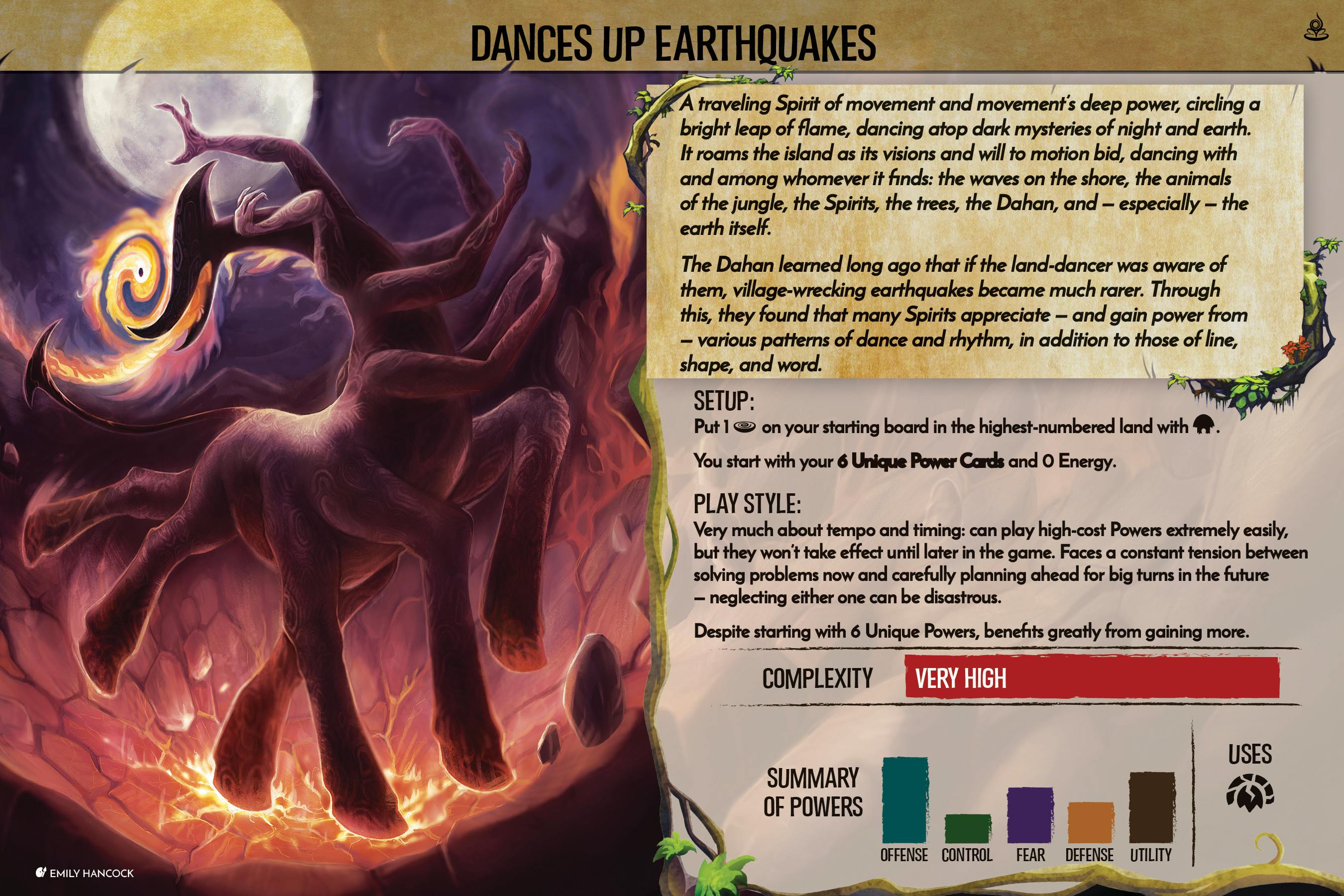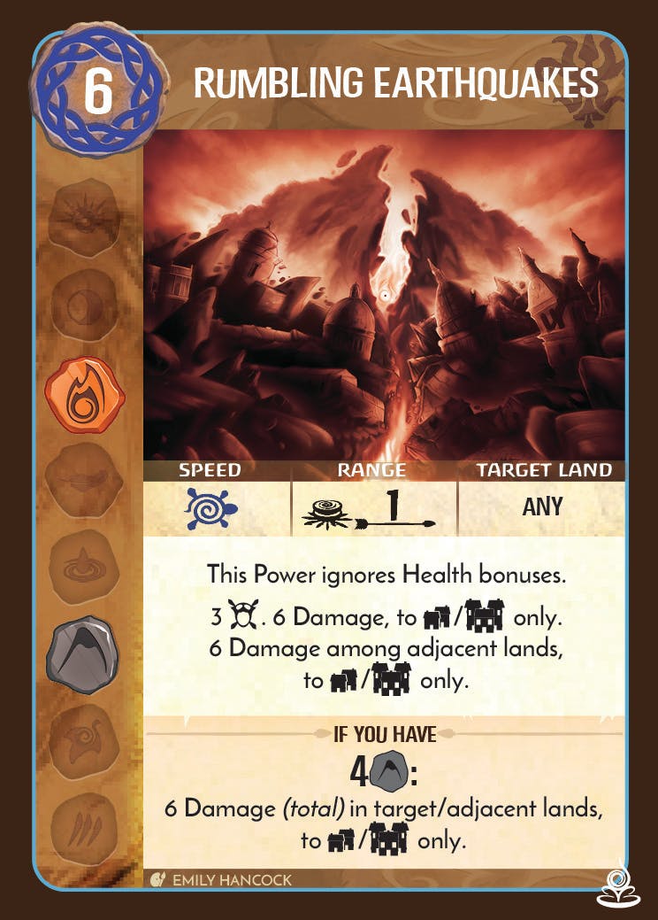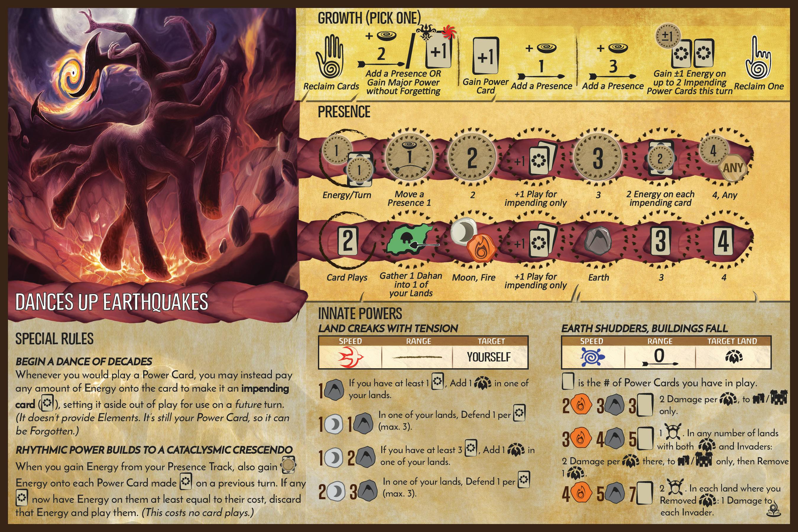 Dances Up Earthquakes was one of the trickiest Spirits to develop, since it had all of the development problems of a normal Spirit on top of having a completely different value for Power Cards, Energy, Plays, and Elements. Rather than attempting to cover the breadth of challenges that we faced, I’m just going to examine the most persistent one: stopping a particular dominant strategy that isn’t fun to play.