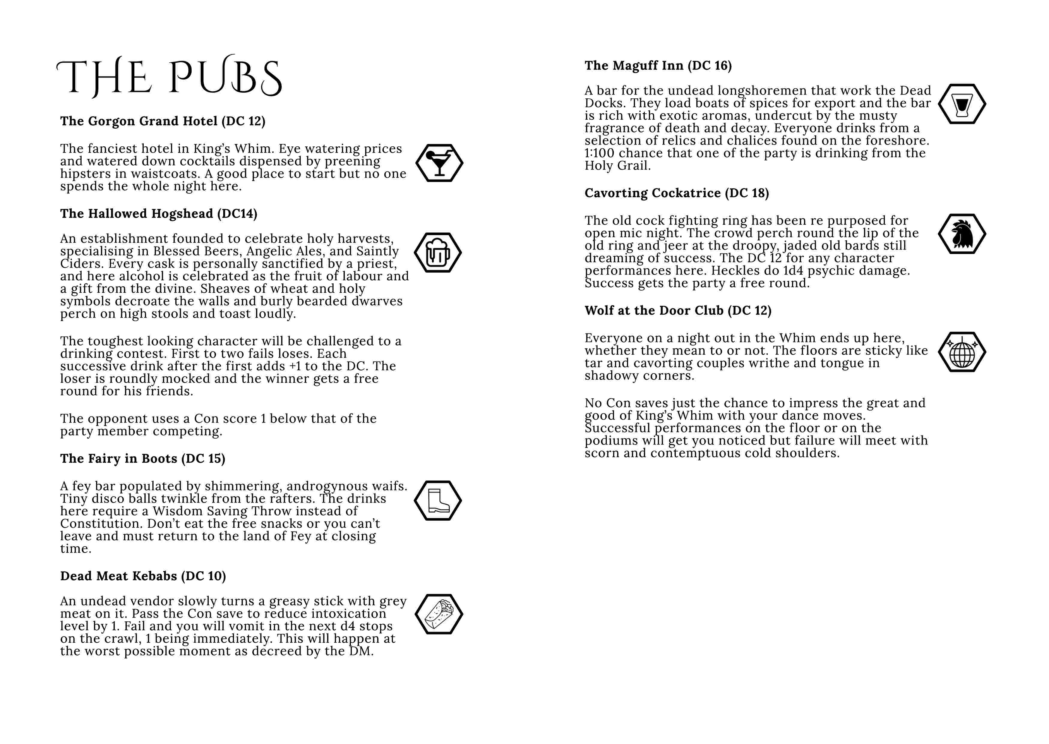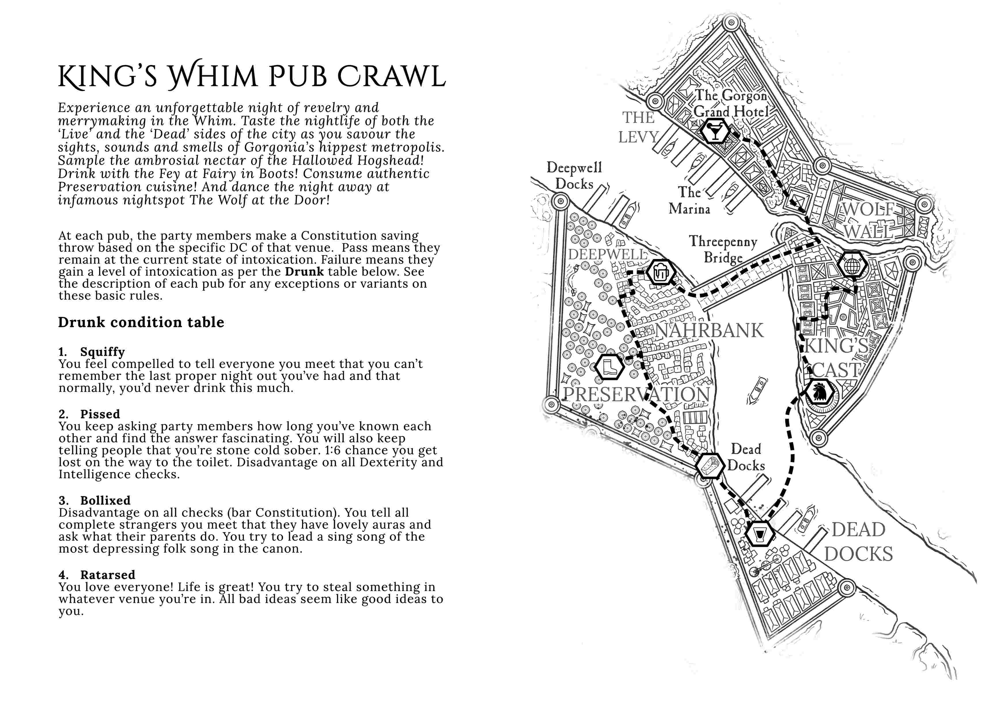 First up, is the King's Whim pub crawl. It's my attempt to capture the chaos of a real night out in point crawl format. Hopefully, some backers will recognise their own suggestions in there- hope I did them justice. Feel free to give it a bash and let me know how it goes. Real drinking along is, of course, optional and at your own risk.
