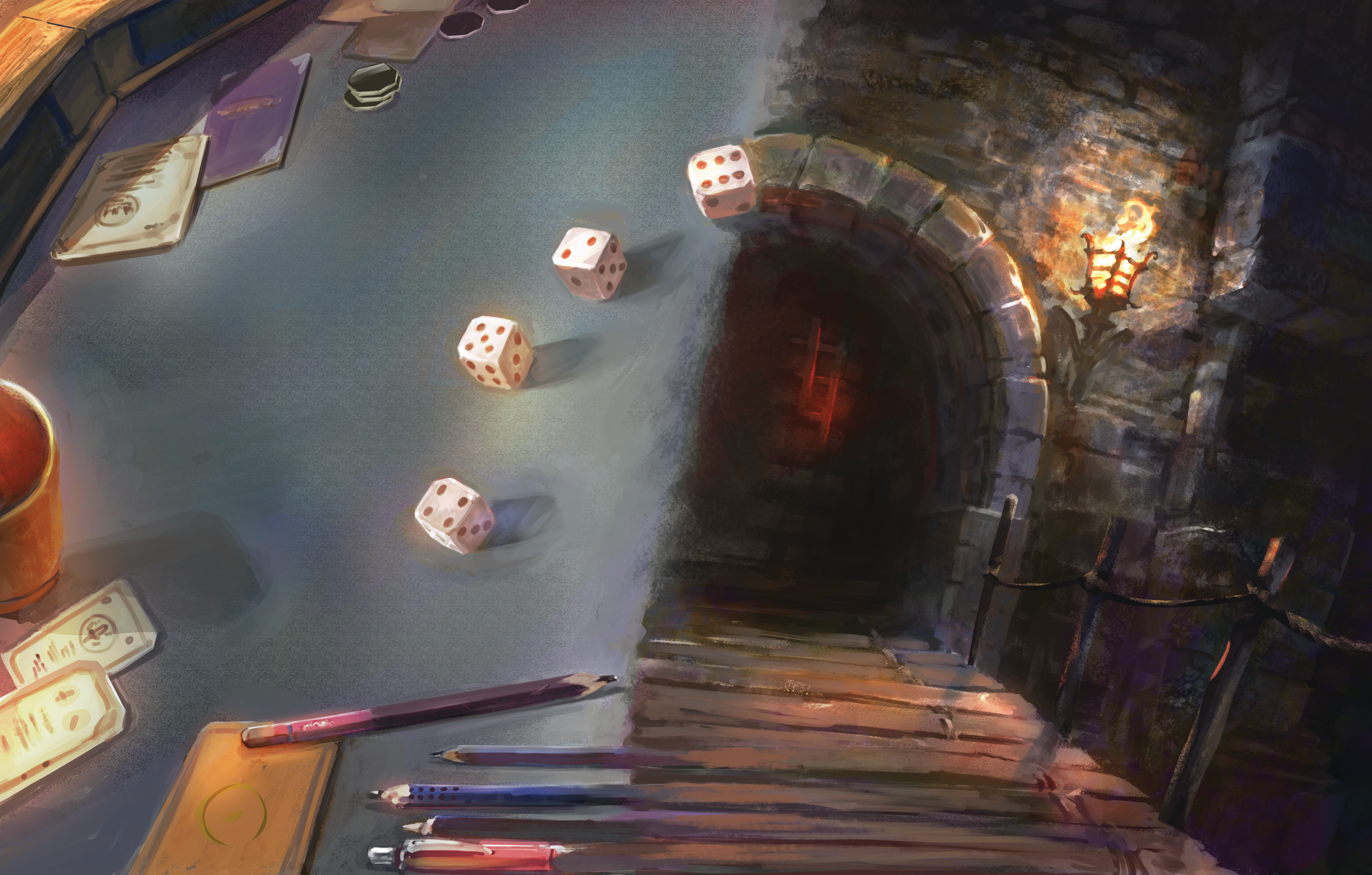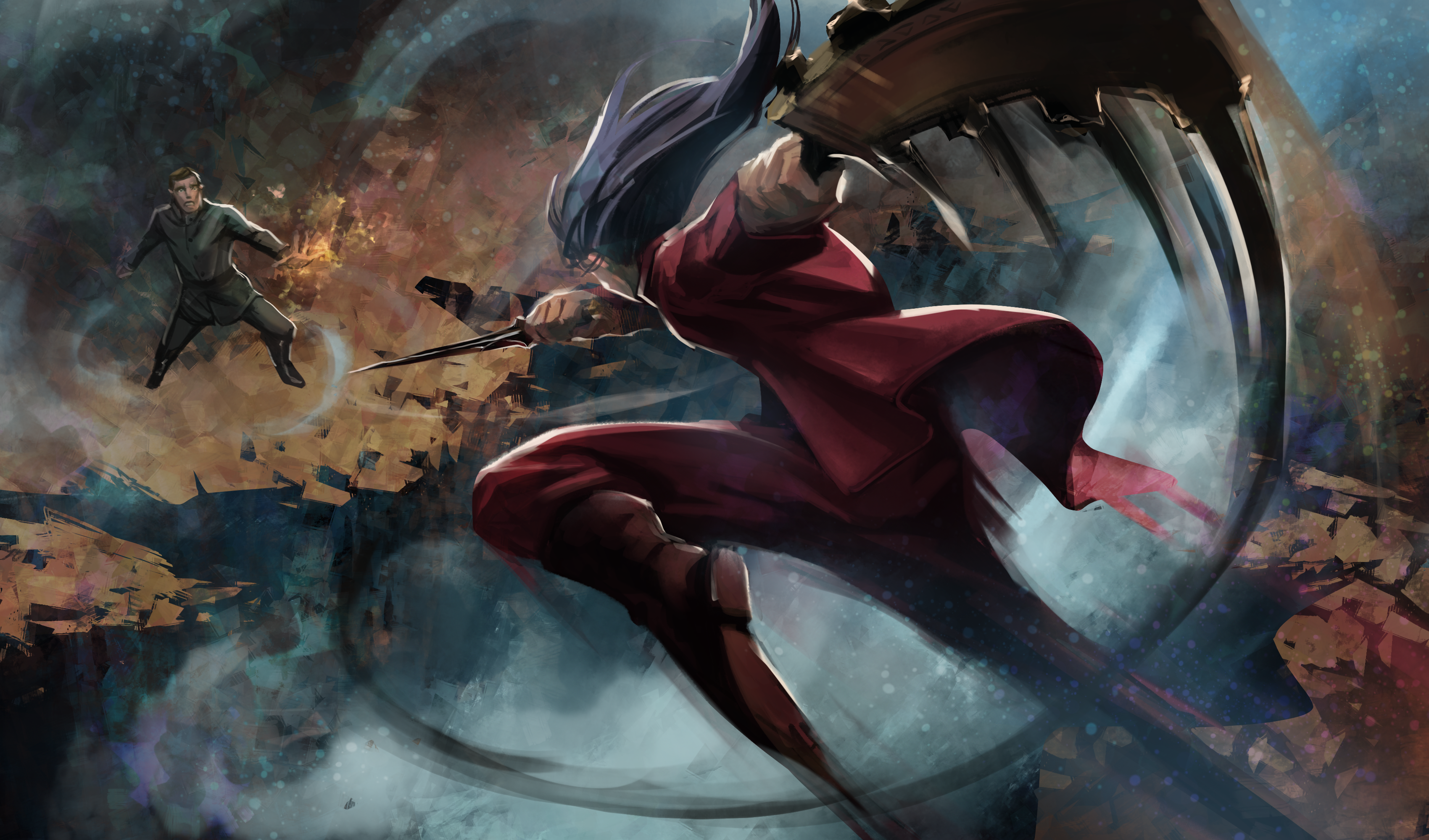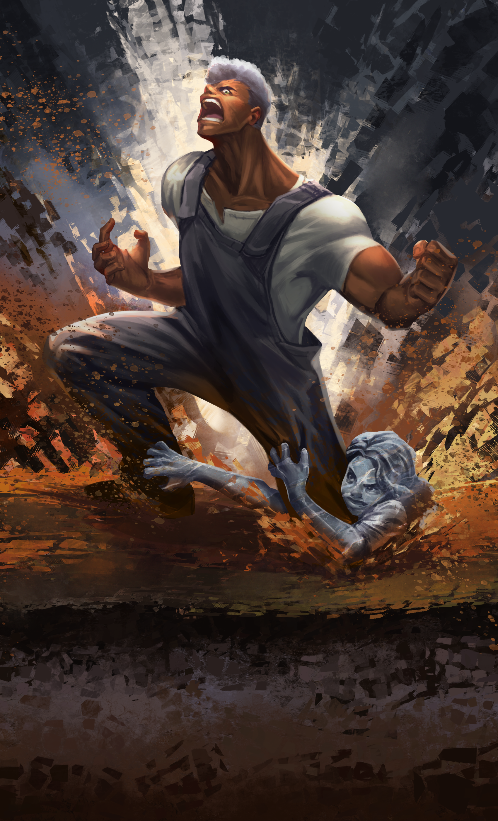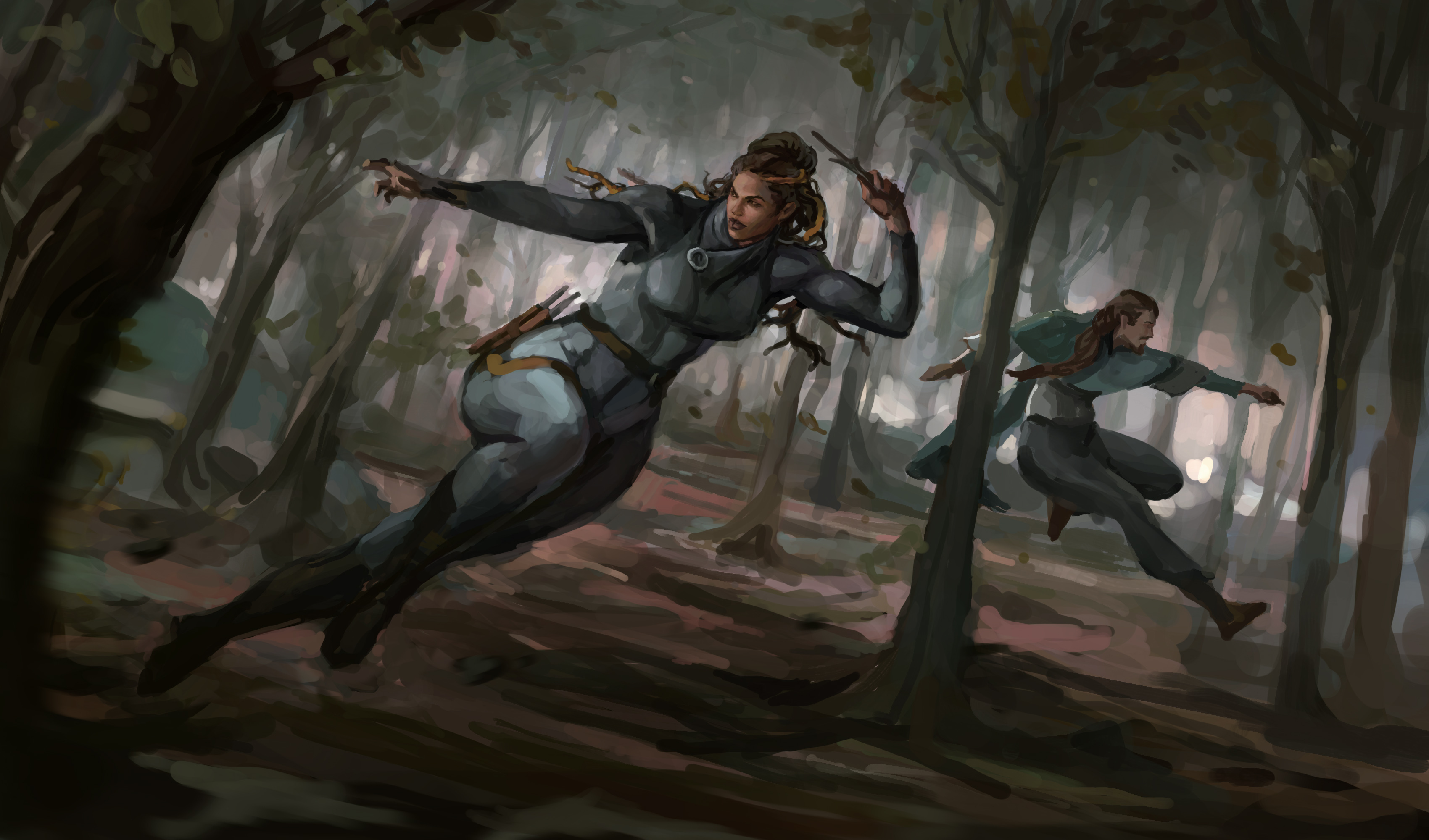Rounding out the gorgeous illustrations by our talented artists is this exciting painting by Danil Luzin. These two characters are on the run, although the Strongback’s knives may cut their pursuit short.