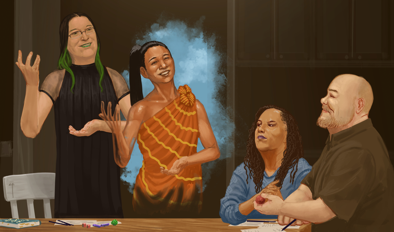 Keeping the theme of manifesting characters and events in the Stillness, we have this painting by Claudio Pozas. It features me as the GM, roleplaying as a Western Coastals woman who’s providing information to Tanya DePass and Joe Carriker’s characters.
