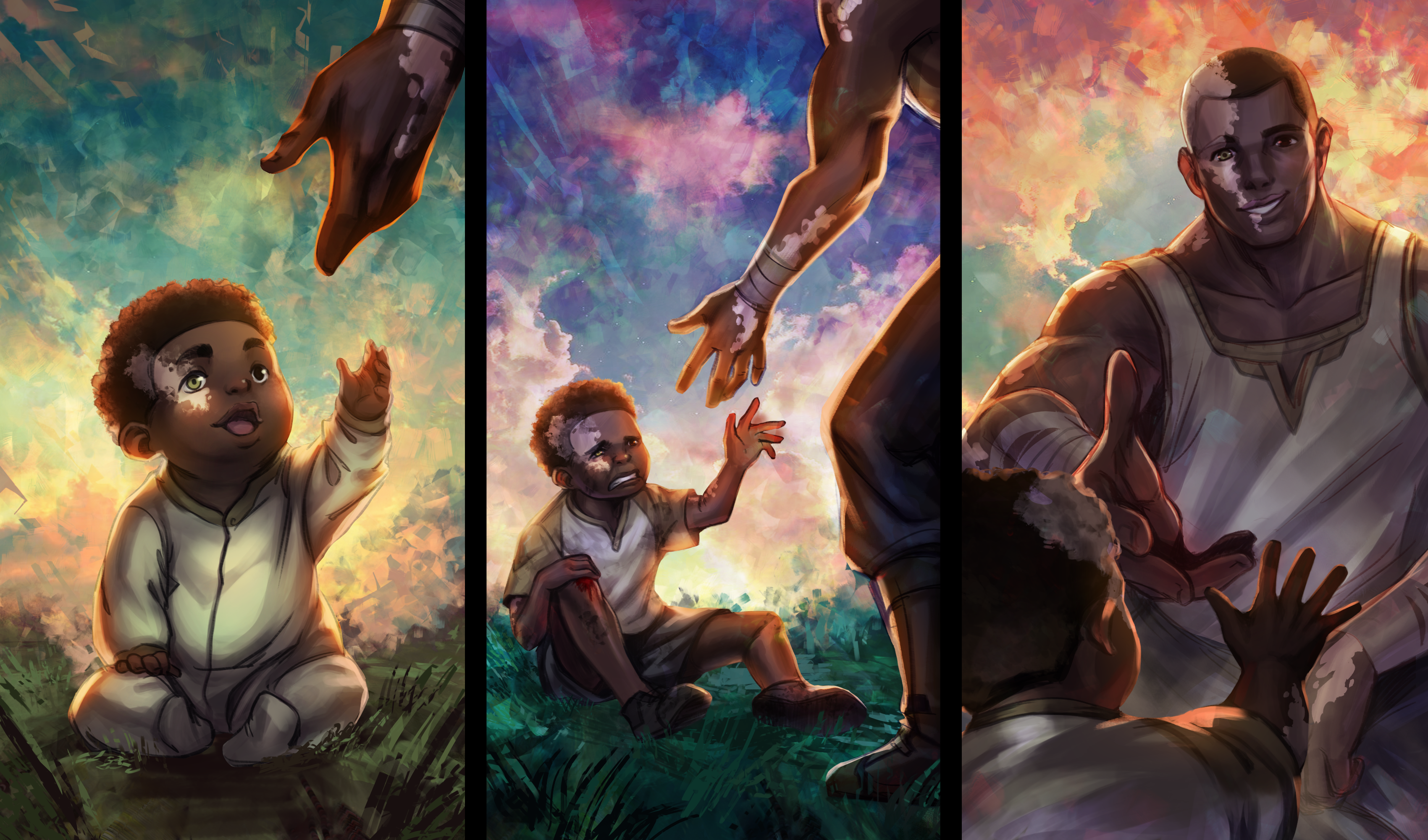 This piece by Julie Sakai shows how characters grow and mature and how the same person who needs a helping hand one day can become the person providing a helping hand to others as they grow up.