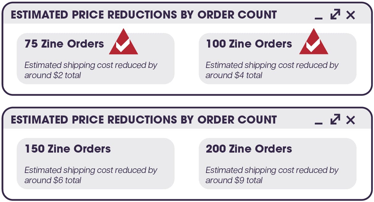 We will not be offering any further stretch goals so that all of the additional money can go back to the backers— credited as discounts to shipping! These zine shipping discounts apply to EVERYONE, regardless of your address. All prices in USD.