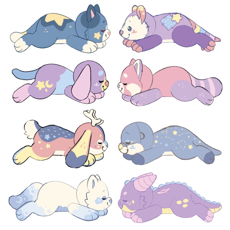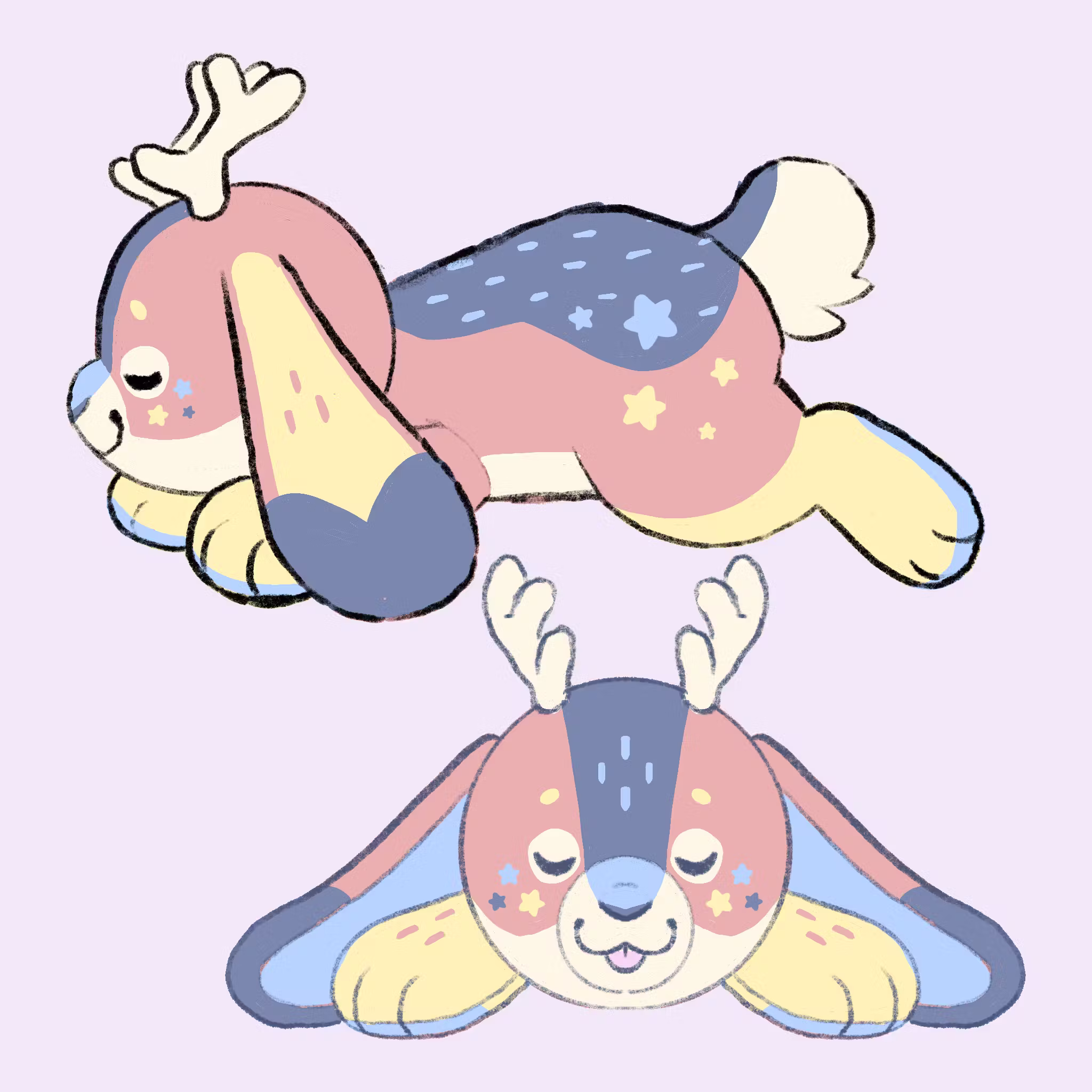 The second design has similar marking placement, but since there are no characters with pink as the main color, I wanted to give something pink a go. I went with sparkles and mushroom spot details on this design to give it a fairy/magical feel. The larger marking placement for both designs draws from jackrabbits as well as deer fawns!