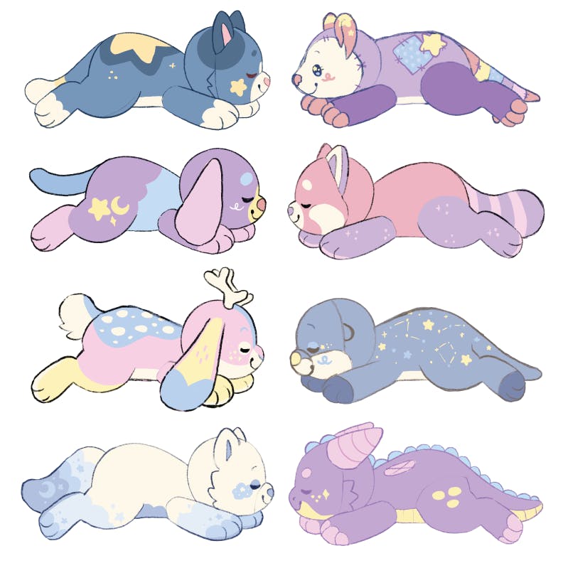 For both designs, I'm not 100% set on the details, but I like the general direction for each of them! Here are each of them next to all the other buddies so far so you can see how they look with your other favorites!