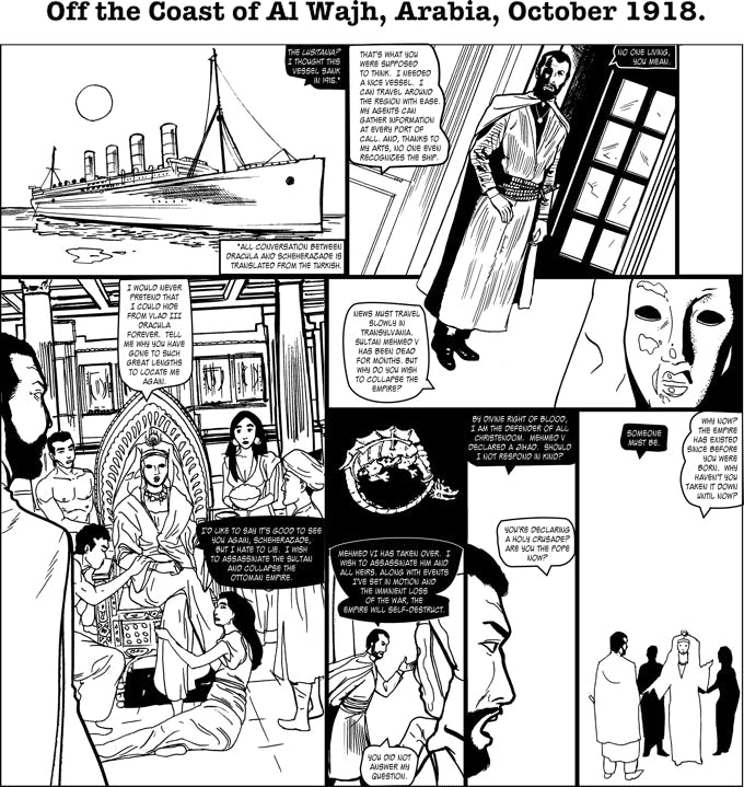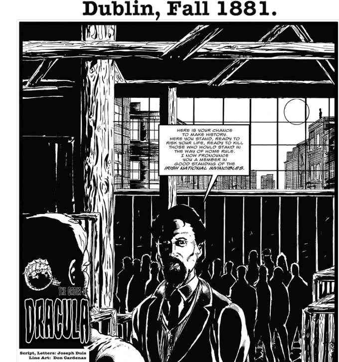 THE ORDER OF DRACULA Vol. I (166 pages, black & white) and # 5  (24 pages, black & white) - When an Irish separatist allies with Dracula to free his people, will he become a patriot or a terrorist? THE ORDER OF DRACULA Vol. I collects the first four issues, showing the story of how James Fitzharris makes a deal with the immortal vampire and they and their allies fight a mysterious foe in Arabia during World War I. THE ORDER OF DRACULA # 5 is a what-if story in which Dracula is reincarnated 500 years after his death in Romania - or is he merely a delusional mental patient? Individual issues of # 1 (single issue is in full color) through 3 (issues 2 and 3 are black & white) are also available (# 4 is out of print but is reprinted in VOLUME I).