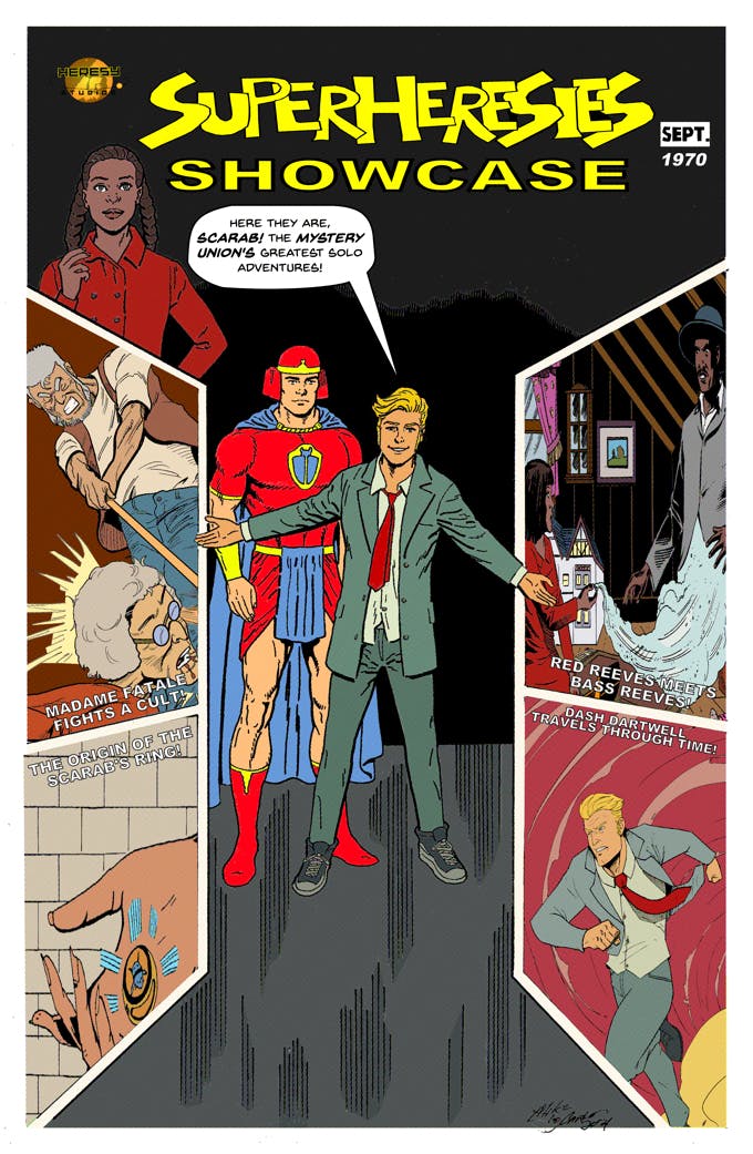 SUPERHERESIES - If Rod Serling had created superhero comics! What if Golden Age public domain comic book heroes continued on and aged in real time, but didn't have to worry about The Comics Code Authority? The SUPERHERESIES line includes SUPERHERESIES (28 pages in flat color), a "sampler" of one solo, one duo, and one team story; and three issues of SUPERHERESIES SHOWCASE (1970 is 40 pages; 1971 and 1974 are each 32 pages; all flat-colored), anthology comics that include several solo superhero stories with covers by Mike DeCarlo and interior art by several artists, including Jose Raul Orte Crespo, Kyrun Silva, Greg Woronchak, Brenda Salazar, Luca Cicchitti, and more. Going along with each of the SHOWCASE issues is a separate volume reprinting the first 1930s and 1940s appearances of each hero.