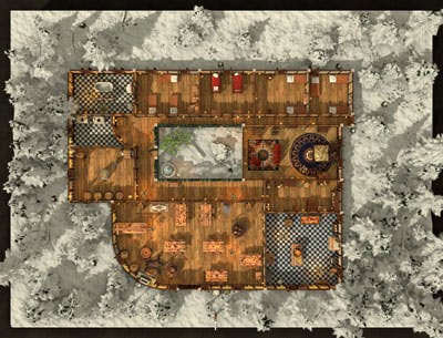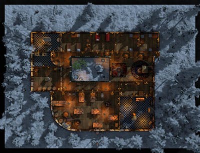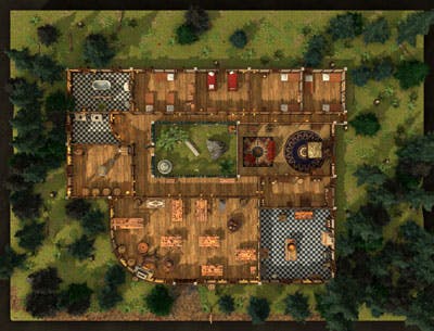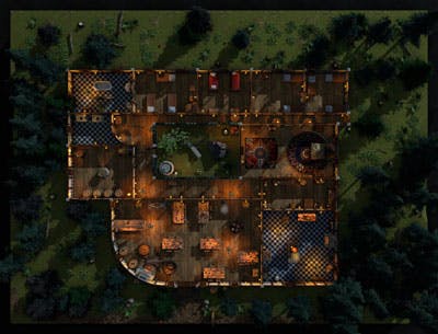This detailed map features a large, cosy tavern with accommodation for 15 to 16 people set on the roadside of a forest. It includes a great room (bar area), a kitchen, a brewery, bathrooms and bedrooms with a total of 12 rooms and 1 hallway.
