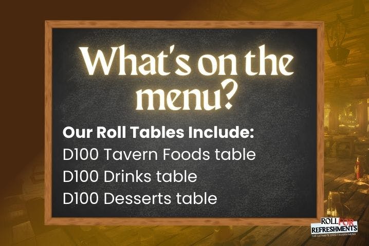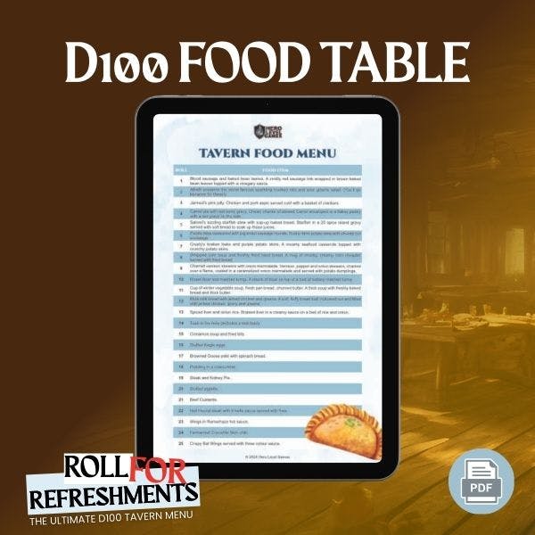 Why invent menus on the fly? Roll for Refreshments gives you 100 ready-to-serve tavern items including hearty meals and questionable entrees. Still not full? Add on the Drinks d100 and Deserts d100 tables, creating the ultimate no prep tavern toolkit!