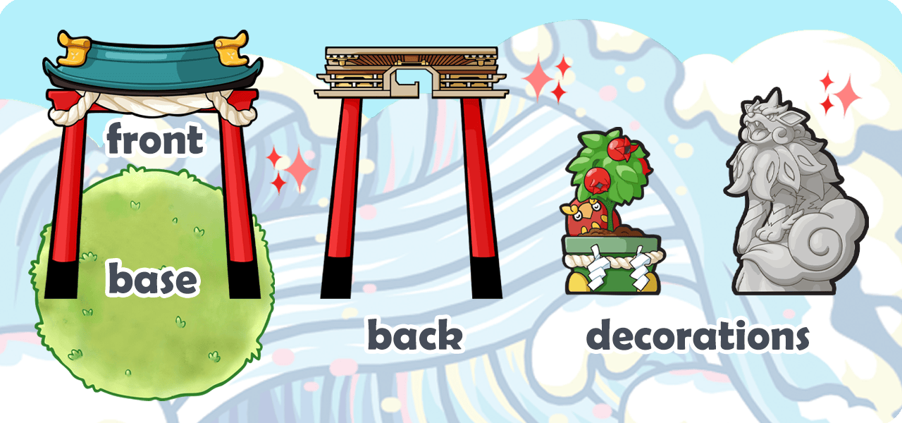 The standee consists of a base with 4 slots for upright parts-- I'll use colours for clarity: The black part is placed in the middle and acts as the shrine front. The red part has a hook to hang the pin from and is placed behind it. This also adds depth to the shrine! :) In front of the shrine there's space for decorations.