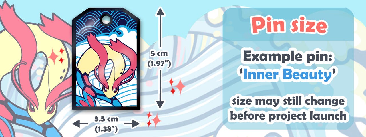 Pin size The planned measurements for now are approximately 5cm x 3.5cm (1.97" x 1.38") but can still change depending on practicality of the design, charm attachment and the final design of the shrine standee.