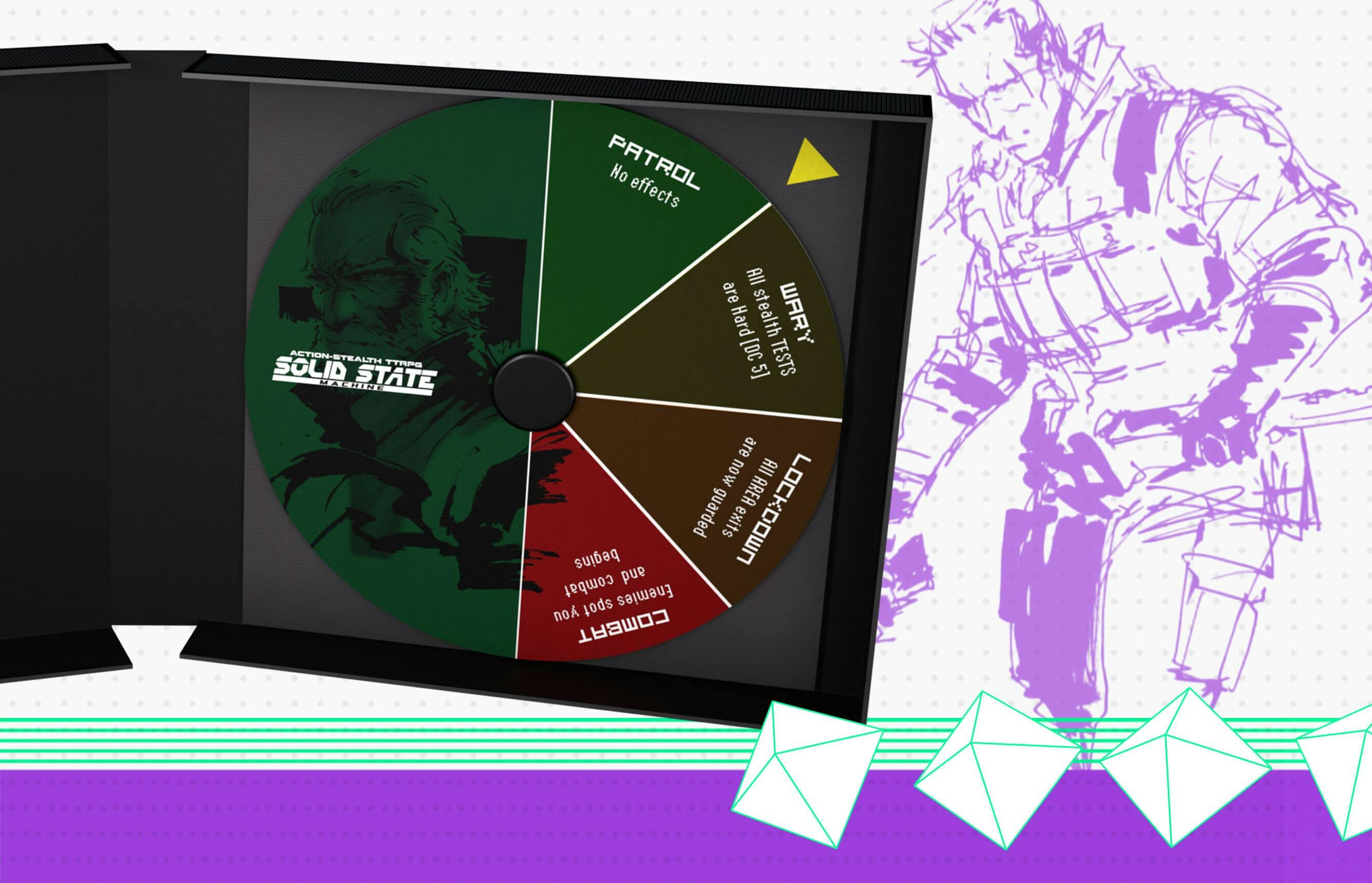 Solid State Machine is built around a simple idea: stealth isn’t passive. You don’t roll to stay hidden. You roll while acting in stealth: moving, hacking, sabotaging, taking down enemies. Every action carries risk, and every roll can shift the balance. This is reflected by the Alert Level, tracked by the Game Disc. The more noise you make, the more pressure builds. Raise the Alert, and the game responds immediately: enemies reposition, reinforcements arrive, situations spiral. There’s a constant, escalating tension you can feel at the table.