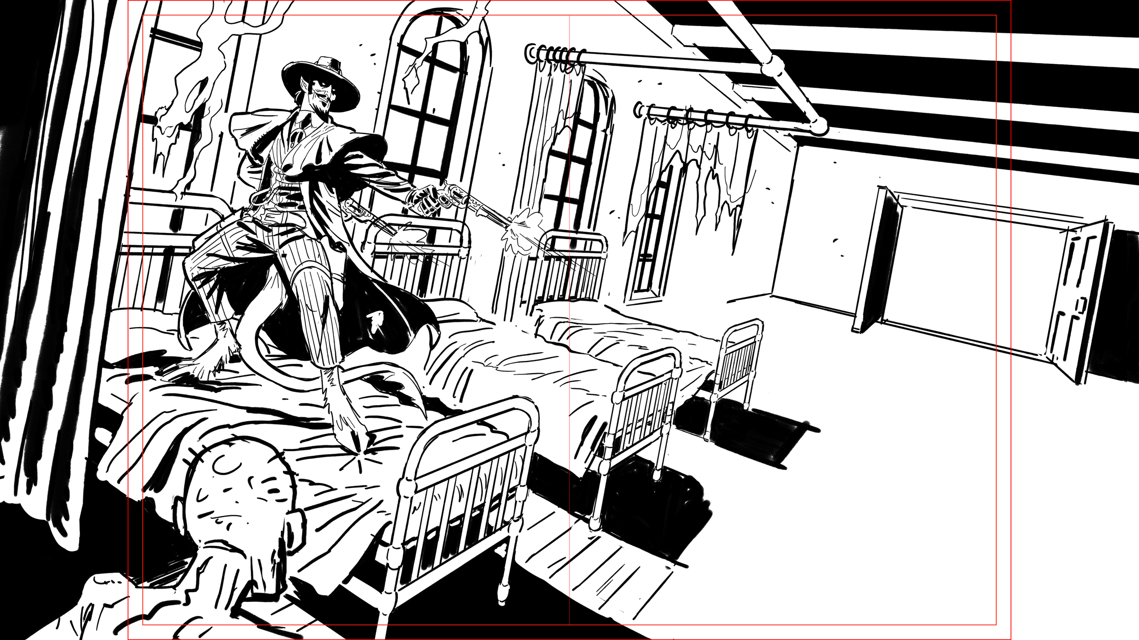 I worked on the cleaner sketch in two phases, since it was a crowded scene. First I locked down the angle and perspective of the room and then sketched in the Devil. He’s a flashy, dramatic gunslinger so he’s pulling off some behind-the-back trick shots to take out his adversaries stylishly. He’s got a bit of Dante from Devil May Cry in him.