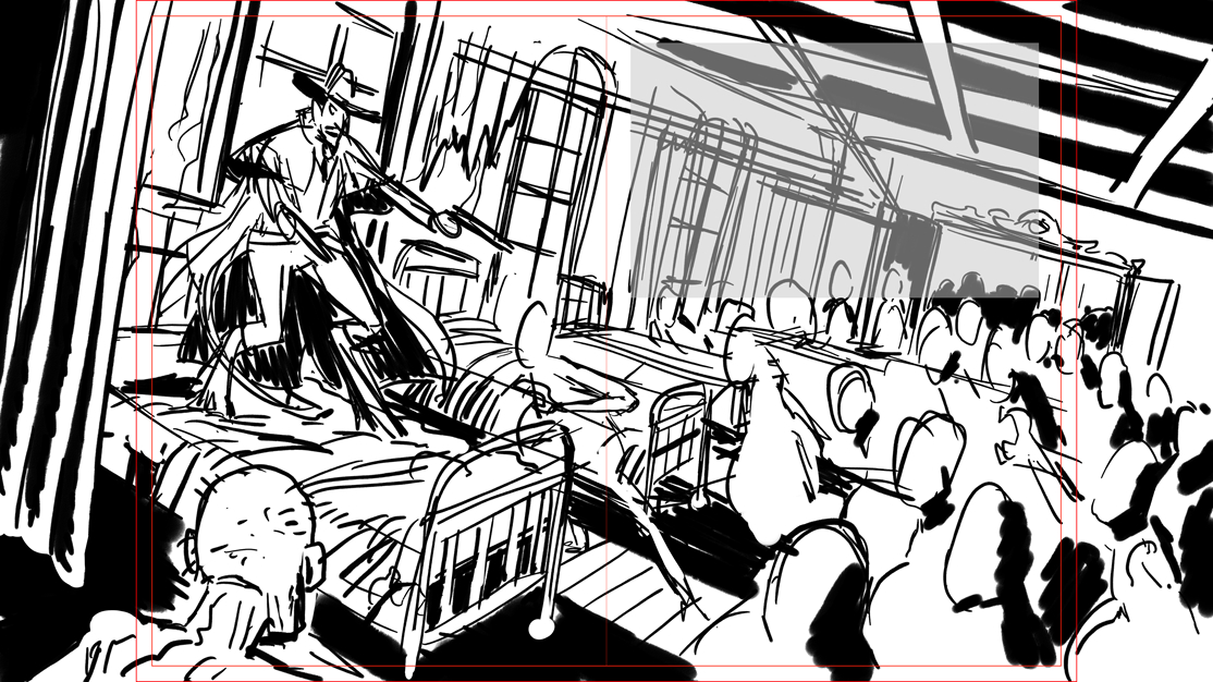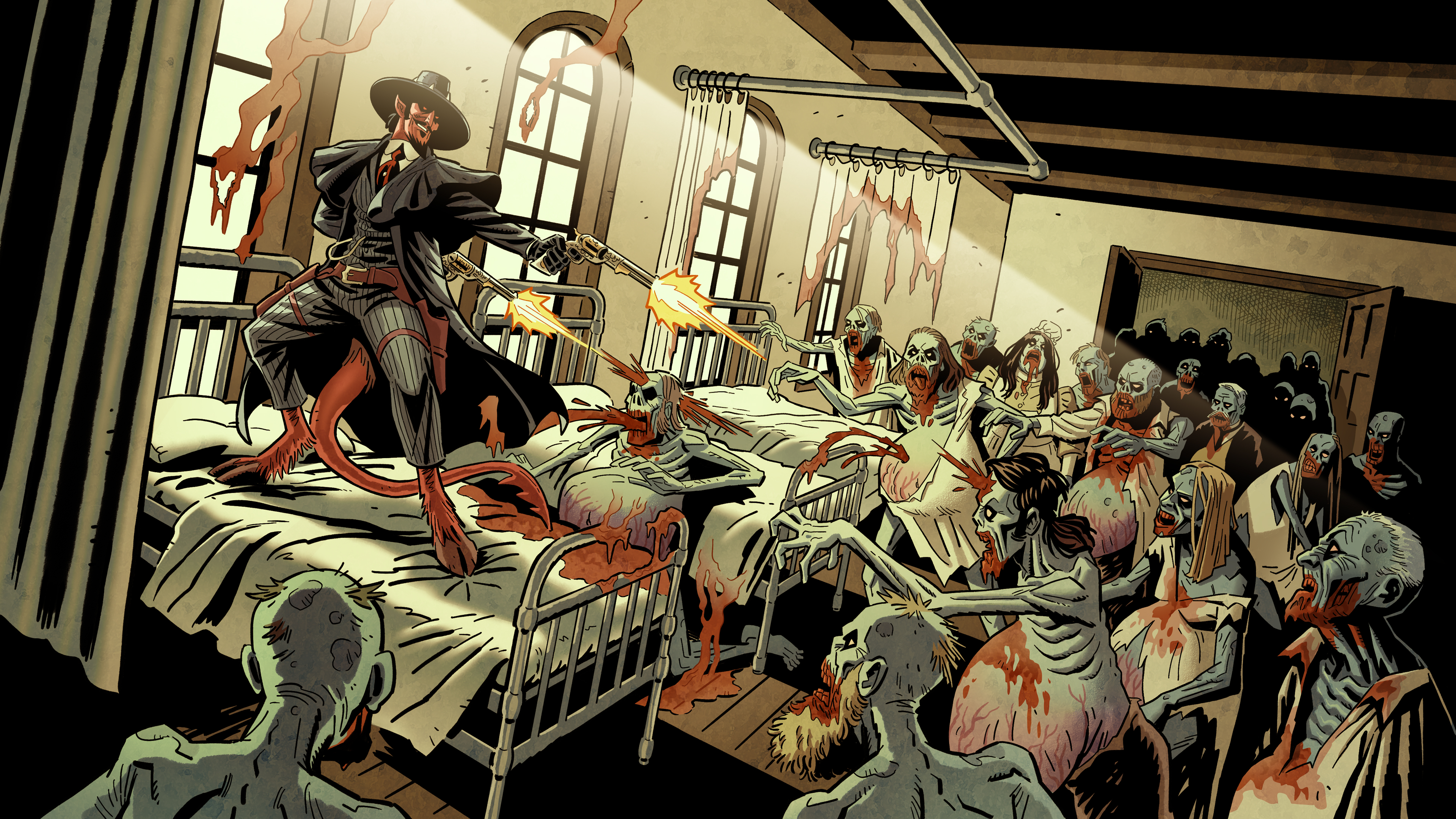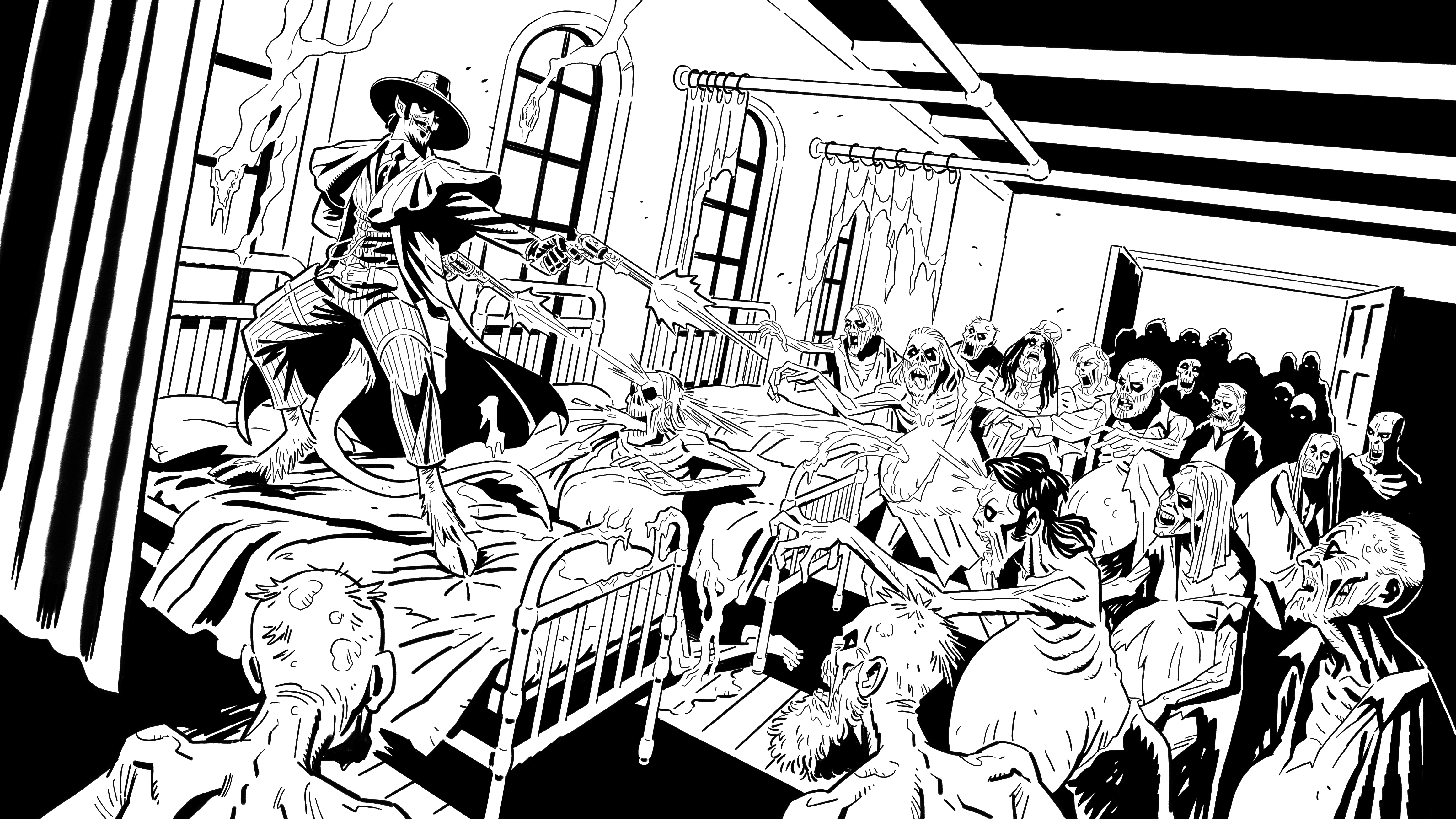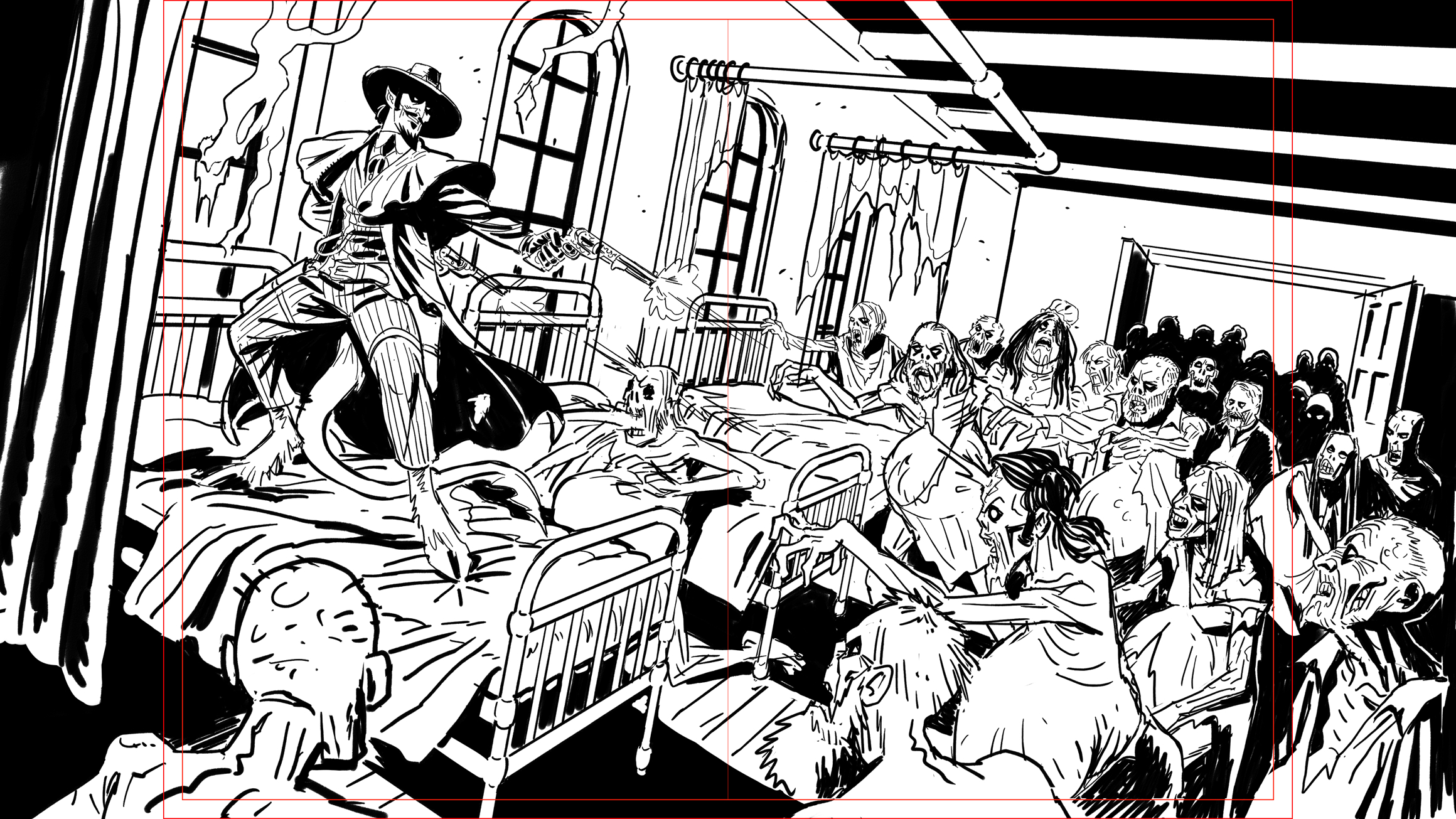 Let’s look at the process that went into the Consumptive Sanitarium illustration. In the lore of Huckleberry, the Consumptives are living dead who have died from tuberculosis and come back somewhat….agitated. Their swollen bellies are filled with acidic blood and bile, and they use it to attack your Maverick! For this illustration, Steven asked me for an homage to zombie movies, set in an 1800s consumption sanitarium, with our Devil Maverick keeping the horde at bay with his pistols. He asked for the Devil to be in some sort of elevated position too.
