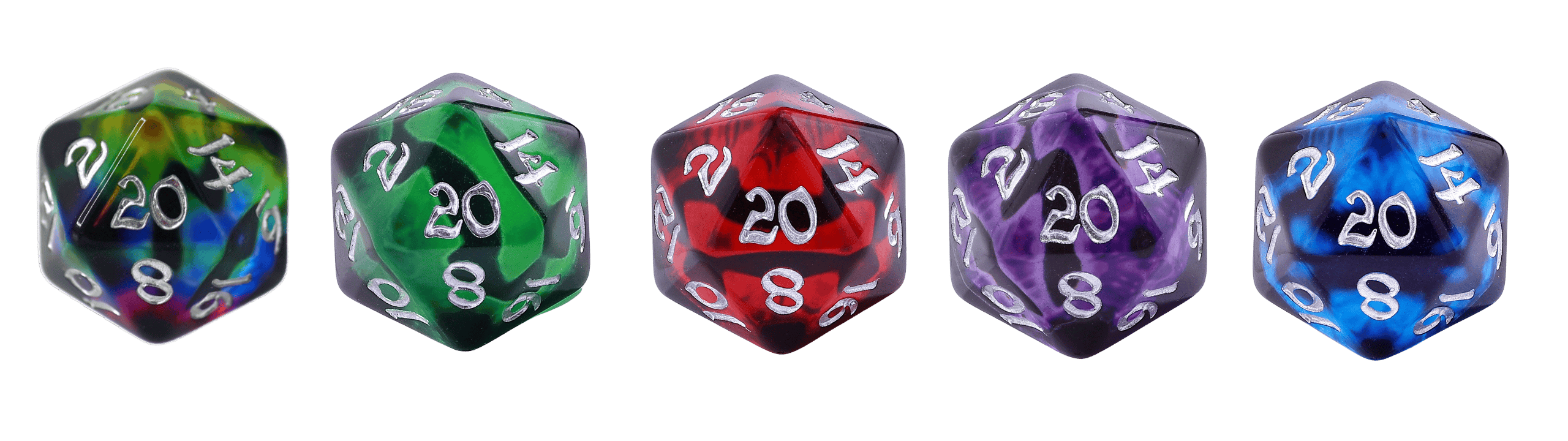 Color choices for Draconic Gaze round edge resin dice include blue, rainbow, red, purple, and green.