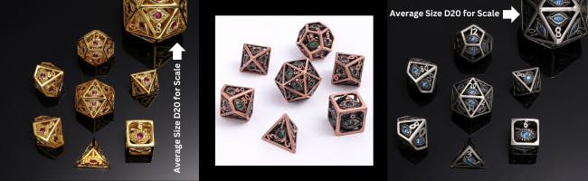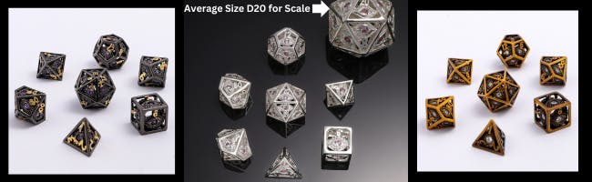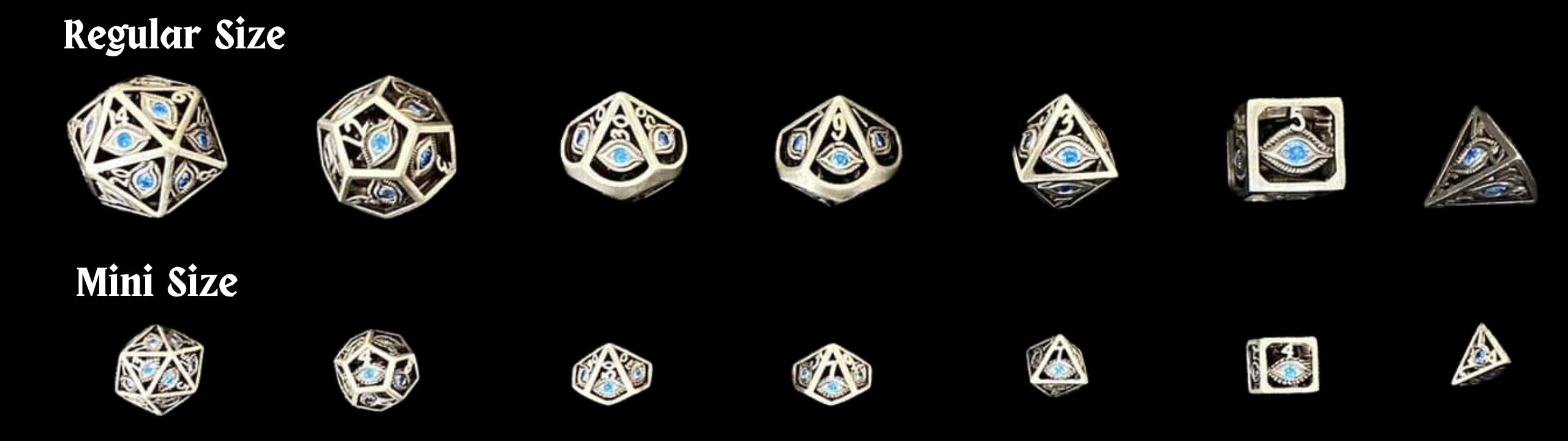 You'll receive one full size set and one mini size set of our Dragon's Eye hollow metal dice. Colors will be chosen and shipping calculated in the pledge manager. Backerkit $115 - MSRP $149