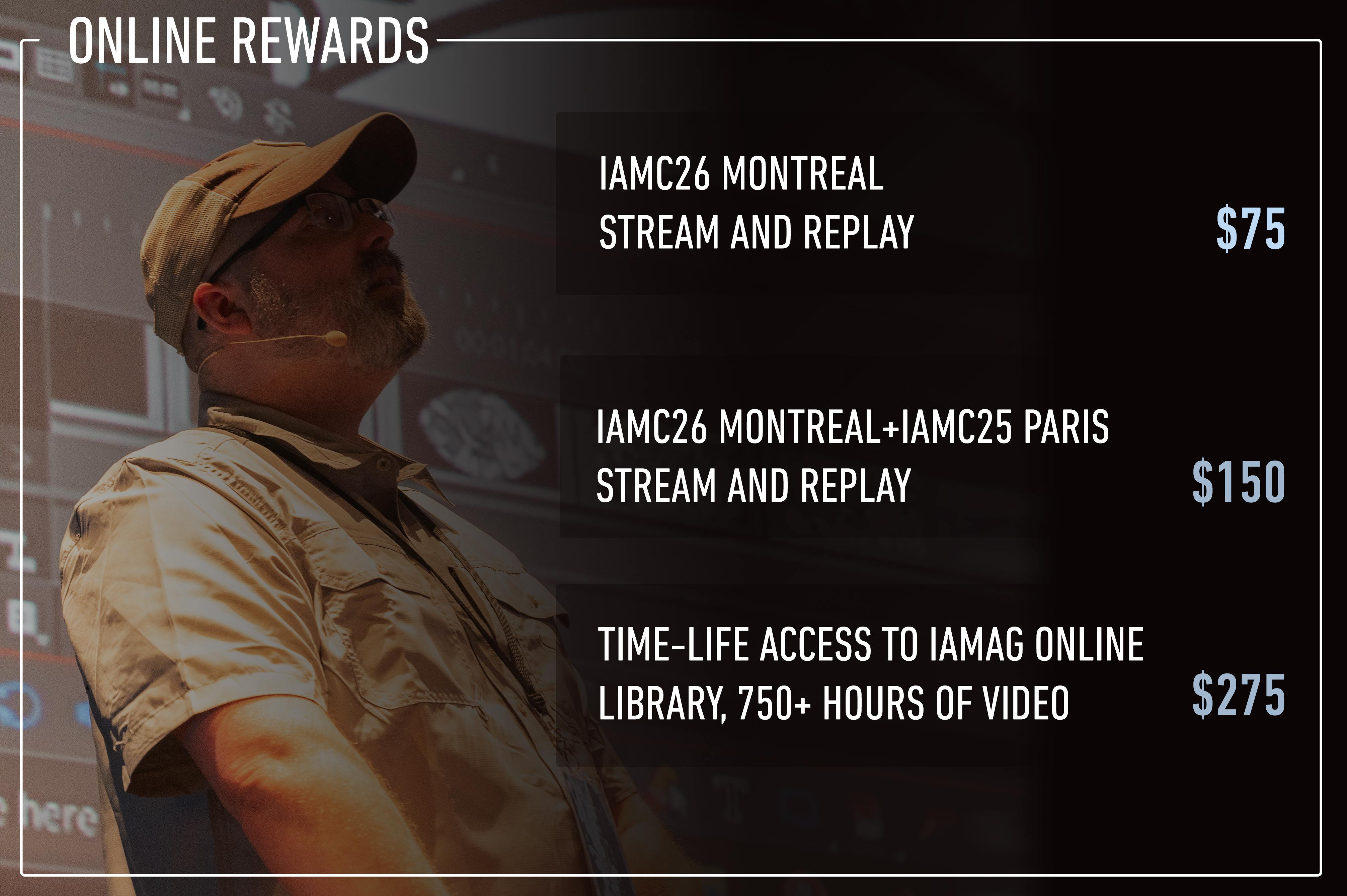 Online rewards provide streaming access to IAMC events, with options ranging from IAMC26 in Montreal to IAMC25 Paris and IAMC26, complete with replays. For those seeking the ultimate online experience, the Lifetime Access pledge opens up the entire IAMAG video library, featuring over 750 hours of past, present, and future content.